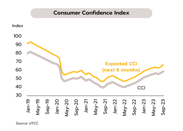ปัจจัยหนุนจากผู้บริโภคมีความเชื่อมั่นหลังจากมีการจัดตั้งรัฐบาลใหม่และได้มีมาตรการช่วยเหลือประชาชนเกี่ยวกับค่าใช้จ่ายด้านค่าไฟฟ้า และราคาน้ำมันดีเซล การพักหนี้เกษตรกรรายย่อย และมาตรการสนับสนุนภาคท่องเที่ยว การบริโภคภาคเอกชนในช่วงครึ่งหลังของปียังมีแนวโน้มเติบโตต่อเนื่องจากช่วงครึ่งแรกของปีที่ขยายตัวสูงกว่า 6.8% YoY ปัจจัยหนุนนอกจากมาตรการต่างๆ ของภาครัฐแล้ว ความเชื่อมั่นผู้บริโภคยังมีทิศทางทยอยปรับเพิ่มขึ้นต่อเนื่อง สะท้อนจากดัชนีความเชื่อมั่นฯ คาดการณ์ในอีก 6 เดือนข้างหน้าปรับตัวเพิ่มขึ้นสู่ 66.7 ซึ่งเป็นระดับสูงสุดนับตั้งแต่เดือนมีนาคม 2563 และเพิ่มขึ้นต่อเนื่องจาก 64.2 ในเดือนสิงหาคม
