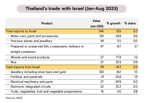 ขณะที่ล่าสุดปัญหาความขัดแย้งทางภูมิรัฐศาสตร์ที่รุนแรงขึ้นในอิสราเอล ในเบื้องต้นหากสถานการณ์ไม่ลุกลามรุนแรงคาดว่าจะมีผลกระทบทางตรงต่อการส่งออกของไทย ค่อนข้างจำกัด เนื่องจากอิสราเอลนับเป็นประเทศคู่ค้าลำดับที่ 40 ของไทย ในช่วง 8 เดือนแรกของปีนี้ไทยมีมูลค่าการส่งออกไปอิสราเอลอยู่ที่ 546 ล้านดอลลาร์ (หรือคิดเป็น 0.3% ของมูลค่าการส่งออกรวม) ขยายตัว 12.6% YoY