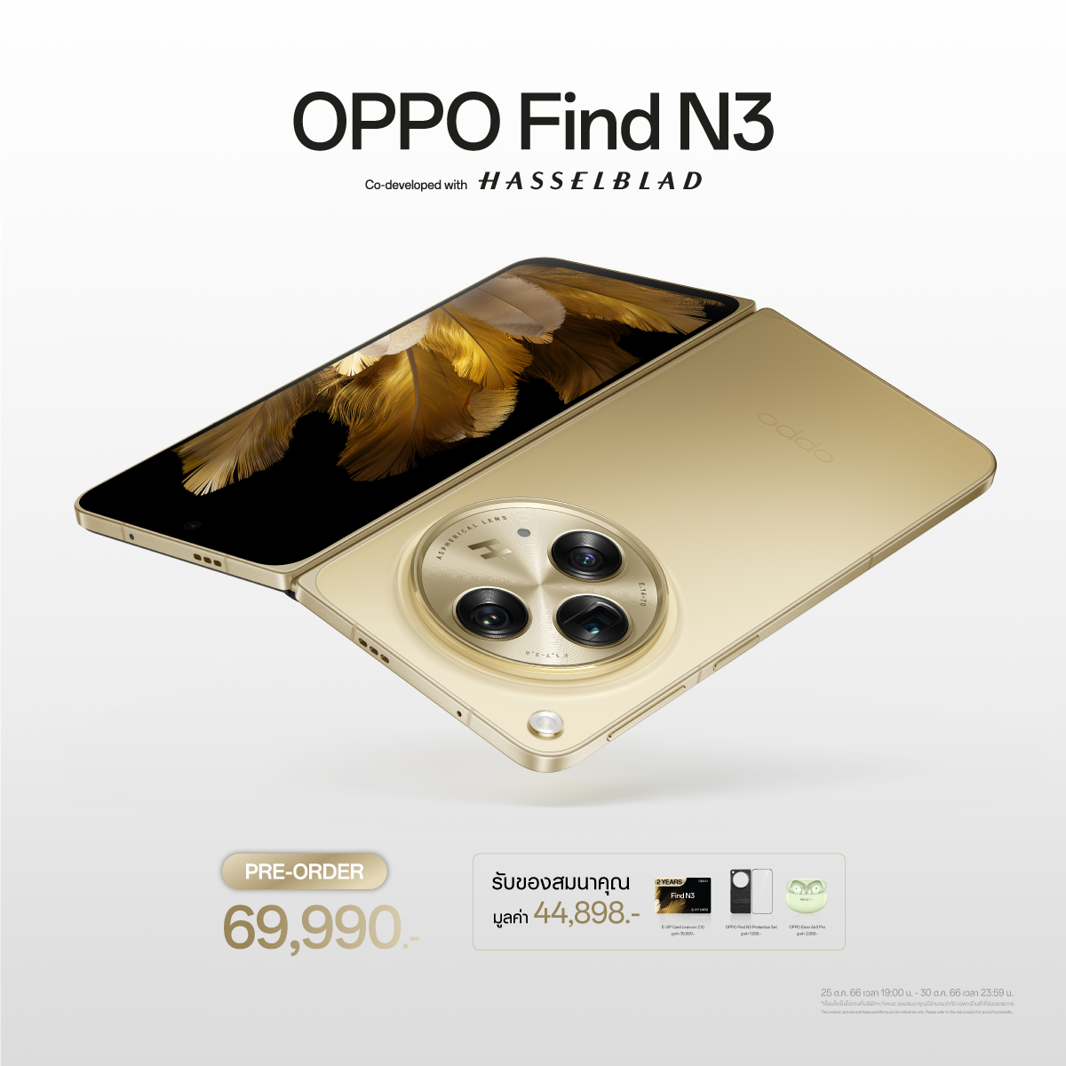 สำหรับ OPPO Find N3 สมาร์ตโฟนจอพับระดับแฟลกชิปที่เบา บาง ทรงพลัง วางจำหน่ายในราคา 69,990 บาท และ OPPO Find N3 Flip วางจำหน่ายในราคา 34,990บาท สำหรับผู้ที่สั่งซื้อ OPPO Find N3 และ OPPO Find N3 Flip ล่วงหน้าระหว่างวันนี้ – 30 ตุลาคม 2566 รับฟรีทันทีของสมนาคุณรวมมูลค่าทั้งสิ้น 44,898 บาท