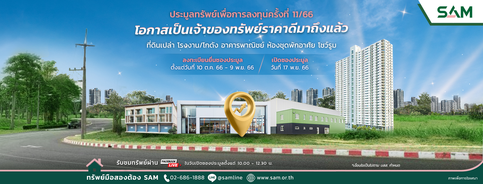 1 พฤศจิกายน 2566 : นายธรัฐพร เตชะกิจขจร กรรมการผู้จัดการ บริษัทบริหารสินทรัพย์สุขุมวิท จำกัด (บสส.) หรือ SAM เปิดเผยว่า ในช่วงไตรมาสสุดท้ายของปีนี้ SAM ยังคงเดินหน้าใช้กลยุทธ์จัดประมูลอสังหาริมทรัพย์มือสองหรือ ทรัพย์สินรอการขาย (NPA) ในทำเลดีทั่วไทย ทั้งทรัพย์เพื่อการอยู่อาศัยและการลงทุน ไม่ว่าจะเป็น ที่ดินเปล่า บ้านเดี่ยว บ้านแฝด ทาวน์เฮ้าส์ อาคารพาณิชย์ อพาร์ทเมนท์ โรงแรม/รีสอร์ท โรงงาน/โกดัง โชว์รูม ฯลฯ จำนวนรวมทั้งสิ้น 36 รายการ รวมมูลค่า 583 ล้านบาท เพื่อเปิดโอกาสให้ผู้สนใจเลือกซื้อในวันที่ 17 พ.ย.และ 1 ธ.ค.นี้