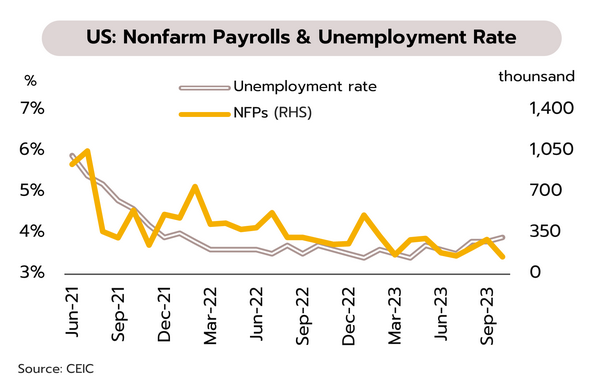 ตัวเลขการจ้างงานที่อ่อนแอกว่าคาด ดัชนี PMI ภาคการผลิตและการบริการที่ปรับลดลงต่อเนื่อง รวมถึงแรงกดดันเงินเฟ้อที่ทยอยลดลง ชี้ให้เห็นว่าเศรษฐกิจสหรัฐมีแนวโน้มที่จะชะลอตัวแรงมากขึ้นในไตรมาส 4 ไปจนถึงปี 2567 จากผลกระทบของการใช้นโยบายการเงินตึงตัวตลอดระยะเวลาปีครึ่งที่ผ่านมา แม้ว่าเฟดยังเปิดโอกาสที่จะปรับขึ้นดอกเบี้ยได้อีกครั้งในการประชุมเดือนธันวาคม แต่วิจัยกรุงศรียังคงมุมมองเดิมว่าอัตราดอกเบี้ยนโยบายจะไม่สูงกว่าระดับ 5.25-5.50% เนื่องจากอัตราดอกเบี้ยแท้จริงอยู่ในระดับสูงนับตั้งแต่วิกฤตการเงินปี 2550 รวมถึงภาพรวมเศรษฐกิจและตลาดแรงงานของสหรัฐที่จะเผชิญกับการชะลอตัวมากขึ้นและยังเสี่ยงต่อภาวะถดถอยทางเศรษฐกิจในปี 2567