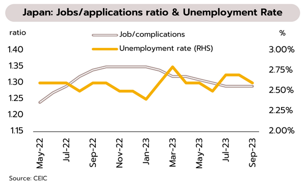 ในช่วงครึ่งหลังปี 2566 เศรษฐกิจญี่ปุ่นยังคงถูกกดดันจาก (i) รายได้แท้จริงที่ติดลบต่อเนื่องจากค่าจ้างแรงงานที่โตไม่ทันเงินเฟ้อซึ่งนำไปสู่การลดลงของกำลังซื้อภายในประเทศ (ii) การชะลอตัวของเศรษฐกิจคู่ค้าที่กดดันรายได้จากการส่งออก และ (iii) แรงส่งทางเศรษฐกิจที่ชะลอลงสะท้อนผ่านดัชนี PMI ภาคการผลิตที่หดตัวมากสุดในรอบ 8 เดือน รวมถึงดัชนี PMI ภาคบริการที่ชะลอลงมากสุดในรอบ 9 เดือน