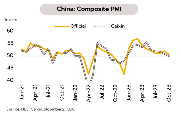 ภาพรวมกิจกรรมภาคการผลิตและบริการของจีนอ่อนแอสุดในรอบ 10 เดือน สะท้อนว่าเศรษฐกิจกำลังสูญเสียแรงส่งในการฟื้นตัว ในเดือนตุลาคม ทางการจีน (สำรวจธุรกิจรายใหญ่) รายงานดัชนี PMI ภาคการผลิตลดลงสู่ 49.5 จาก 50.2 ในเดือนกันยายน ส่วนดัชนี PMI ภาคบริการลดลงสู่ 50.6 จาก 51.7 ด้านภาคเอกชน (สำรวจธุรกิจรายกลางและเล็ก) รายงานดัชนี PMI ภาคการผลิตกลับมาหดตัว (ต่ำกว่า 50) เป็นครั้งแรกนับตั้งแต่เดือนกรกฎาคมที่ 49.5 จาก 50.6 ส่วนดัชนี PMI ภาคบริการขยับขึ้นเล็กน้อยสู่ 50.4 จากระดับต่ำสุดในรอบ 9 เดือนที่ 50.2 ผลบวกจากภาคท่องเที่ยว แต่ดัชนีฯย่อยด้านคำสั่งซื้อใหม่โตต่ำสุดตั้งแต่ต้นปีนี้ ด้านความเชื่อมั่นต่ำสุดในรอบ 3 ปีครึ่ง
