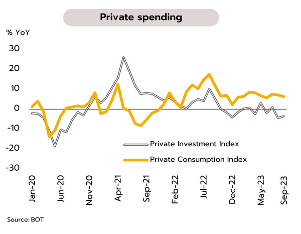 ขณะที่อุปสงค์ในประเทศชะลอลงบ้างหลังจากเร่งตัวไปในเดือนก่อน โดยการบริโภคภาคเอกชนชะลอลง (+6.3% vs +7.0% เดือนสิงหาคม) จากหมวดการใช้จ่ายสินค้าไม่คงทนและสินค้ากึ่งคงทนเป็นสำคัญ อย่างไรก็ตาม การใช้จ่ายในหมวดบริการยังคงเพิ่มขึ้นโดยเฉพาะในหมวดโรงแรมและภัตตาคาร ด้านการลงทุนภาคเอกชนหดตัวต่อเนื่อง (-3.6% vs -4.4%) โดยลดลงทั้งในหมวดเครื่องจักรและอุปกรณ์ และหมวดก่อสร้าง