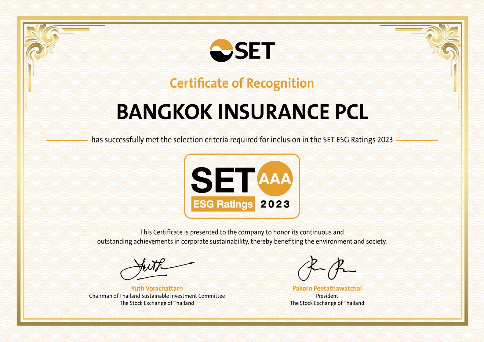 8 พฤศจิกายน 2566 : บริษัท กรุงเทพประกันภัย จำกัด (มหาชน) ได้รับการคัดเลือกจากผลการประเมินในรายชื่อหุ้นยั่งยืนของตลาดหลักทรัพย์แห่งประเทศไทย (SET ESG Ratings) ประจำปี 2566 ในระดับ AAA ซึ่งเป็นระดับสูงสุด โดยกรุงเทพประกันภัยเป็นหนึ่งในจำนวน 34 บริษัทจาก 193 บริษัทจดทะเบียนได้รับการคัดเลือกรายชื่อหุ้นยั่งยืนประจำปี 2566 สะท้อนให้เห็นว่ากรุงเทพประกันภัยมีความโดดเด่นด้านการมุ่งมั่นพัฒนาดำเนินธุรกิจให้เติบโตอย่างยั่งยืนและต่อเนื่อง โดยคำนึงถึงการบริหารงานตามหลักบรรษัทภิบาลที่ดี