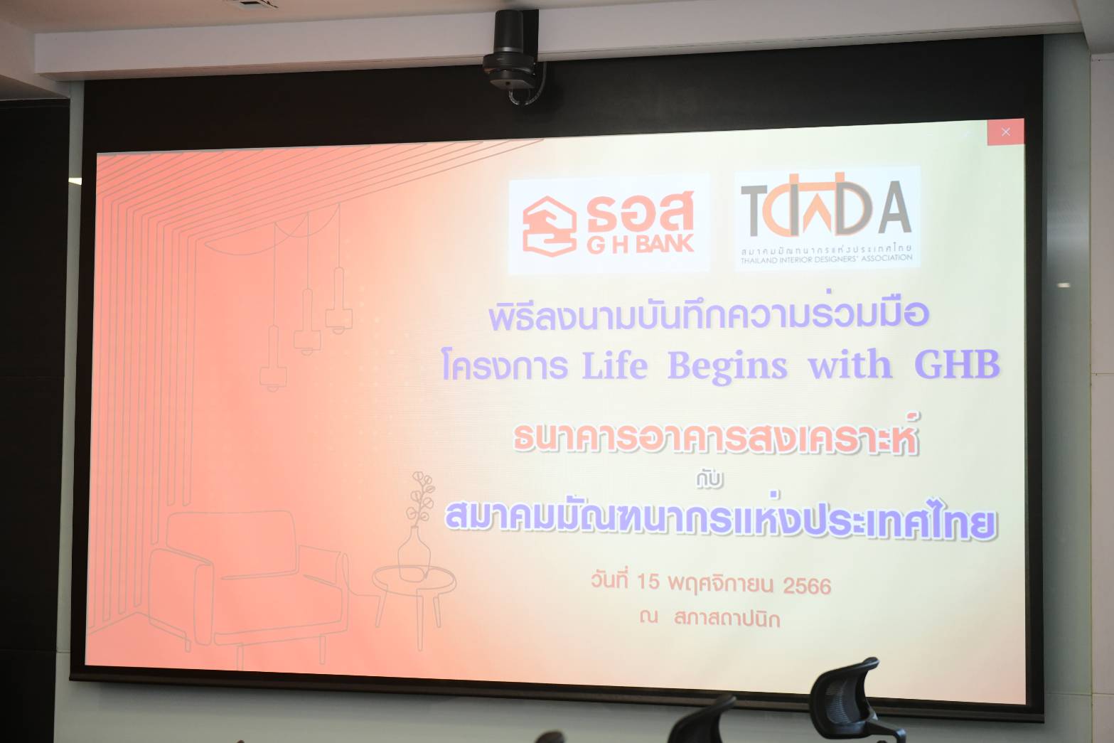 นางสาวกรกช คุณาลังการ นายกสมาคมมัณฑนากรแห่งประเทศไทย กล่าวว่า ในนามของสมาคมมัณฑนากรแห่งประเทศไทย ขอขอบคุณ ธอส. ที่ให้การสนับสนุนให้สมาชิกของสมาคมมัณฑนากรแห่งประเทศไทย กว่า 1,700 ราย ได้มีโอกาสเข้าถึงผลิตภัณฑ์สินเชื่อที่อยู่อาศัยอัตราดอกเบี้ยต่ำและเงินฝากอัตราดอกเบี้ยสูงทำให้ผู้ประกอบวิชาชีพสถาปัตยกรรมภายในและมัณฑนศิลป์ที่เป็นสมาชิกของสมาคมฯ มีโอกาสได้มีที่อยู่อาศัยเป็นของตนเองเพิ่มมากขึ้น และออมเงินในอัตราดอกเบี้ยที่ให้ผลตอบแทนสูง