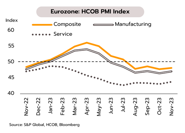 เศรษฐกิจยูโรโซนยังขาดปัจจัยขับเคลื่อนในการเติบโต ขณะที่การชะลอตัวของเงินเฟ้อและเศรษฐกิจเปิดทาง ECB ปรับลดอัตราดอกเบี้ยภายในกลางปีหน้า ในเดือนพฤศจิกายน ดัชนีความเชื่อมั่นผู้บริโภคอยู่ที่ -16.9 ขยับดีขึ้นเล็กน้อยจากเดือนก่อนหน้าที่ -17.8 ขณะที่ดัชนี PMI รวมภาคการผลิตและการบริการอยู่ที่ 47.1 หดตัวเป็นเดือนที่ 5 ติดต่อกัน โดยดัชนี PMI ภาคการผลิตอยู่ที่ 43.8 ส่วนดัชนี PMI ภาคบริการอยู่ที่ 48.2 ล่าสุดธนาคารกลางยุโรป (ECB) เตือนภาวะตึงตัวในภาคธนาคาร (Early signs of stress) เนื่องจากการผิดนัดชำระหนี้เงินกู้เพิ่มขึ้น หรือคุณภาพสินทรัพย์กำลังแย่ลง