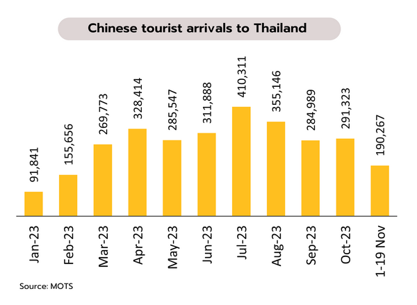 ในช่วง 10 เดือนแรกของปีนี้ ไทยมีจำนวนนักท่องเที่ยวชาวจีนเฉลี่ยต่อเดือนราว 2.8 แสนคน เทียบกับช่วงก่อนเกิดโควิด-19 ซึ่งเฉลี่ยต่อเดือนสูงกว่า 9 แสนคน ขณะที่มาตรการยกเว้นการทำวีซ่า(Visa-Free Scheme) แก่นักท่องเที่ยวจีนที่เริ่มตั้งแต่ปลายเดือนกันยายนที่ผ่านมา ล่าสุดในเดือนพฤศจิกายนมาตรการดังกล่าวยังไม่ส่งผลบวกอย่างมีนัยสำคัญ โดยมีจำนวนนักท่องเที่ยวจีนเฉลี่ยต่อวันประมาณเพียง 10,000 คน จากในช่วงโกลเด้นท์วีคที่เข้ามาสูงสุดถึงวันละ 17,000-18,000 คน จำนวนนักท่องเที่ยวจีนรวมในปีนี้จึงคาดว่าจะอยู่ที่ประมาณ 3.4-3.5 ล้านคนเท่านั้น (ทางการตั้งเป้าไว้ที่ 4-4.4 ล้านคน)