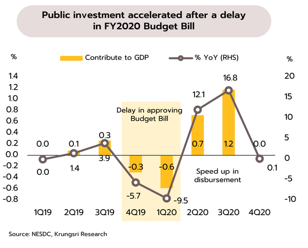 กระบวนการจัดทำร่างพ.ร.บ.งบประมาณรายจ่ายประจำปี 2567 ที่ล่าช้าออกไปจากปกติซึ่งจะเริ่มสามารถเบิกจ่ายได้ตั้งแต่เดือนตุลาคม 2566 จึงอาจทำให้การใช้จ่ายภาครัฐในช่วงไตรมาสสุดท้ายของปีนี้และต่อเนื่องไปจนถึงไตรมาสแรกของปี 2567 เป็นไปอย่างจำกัด หากเทียบกับการเลือกตั้งปี 2562 Contribution to GDP growth ของการใช้จ่ายงบลงทุนใน 4Q2562 และ 1Q2563 ติดลบ 5.7% และ 9.5% ตามลำดับ