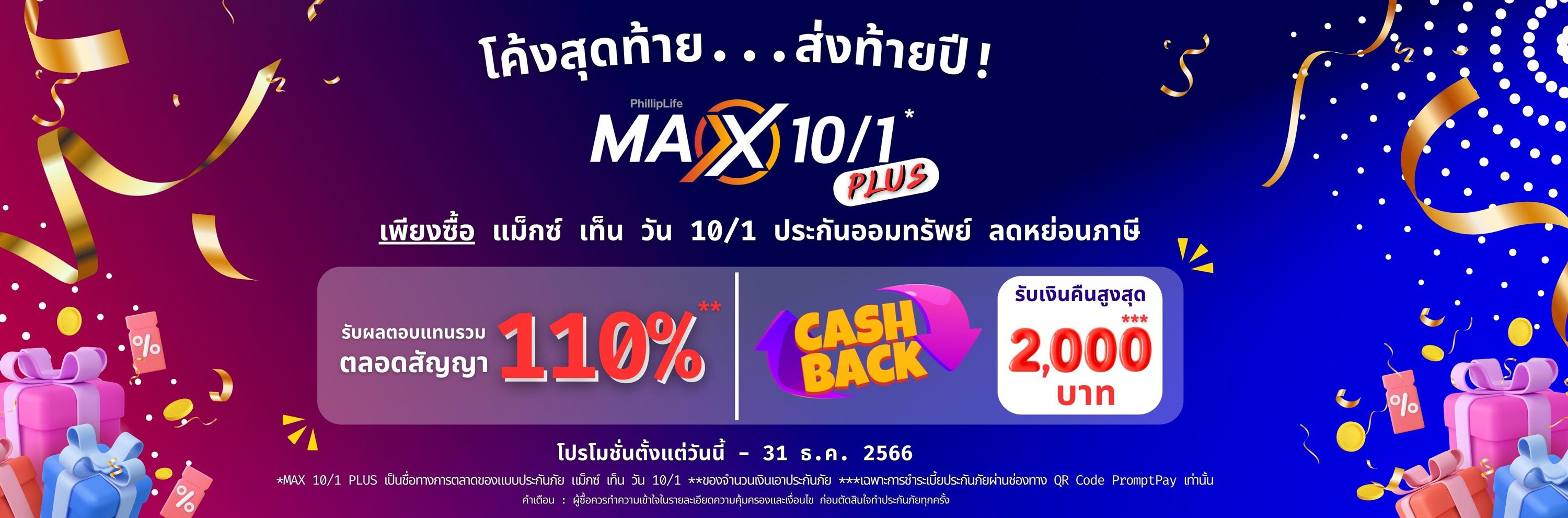 "แม็กซ์ เท็น วัน 10/1 (MAX 10/1 PLUS*)" ประกันออมทรัพย์ที่มีการให้เงินคืนปีที่ 1 - 9 ปีละ 1% ของจำนวนเงินเอาประกันภัย และครบกำหนดสัญญารับเงิน 101% ของจำนวนเงินเอาประกันภัย รวมรับผลประโยชน์ตลอดสัญญาถึง 110% ของจำนวนเงินเอาประกันภัย รับประกันภัยตั้งแต่อายุ 1 วัน - 65 ปี ไม่ต้องตรวจสุขภาพ เลือกความคุ้มครองได้ ตามจำนวนเงินเอาประกันภัยที่นำเสนอ 3 แผน (55,000/75,000/100,000) บาท