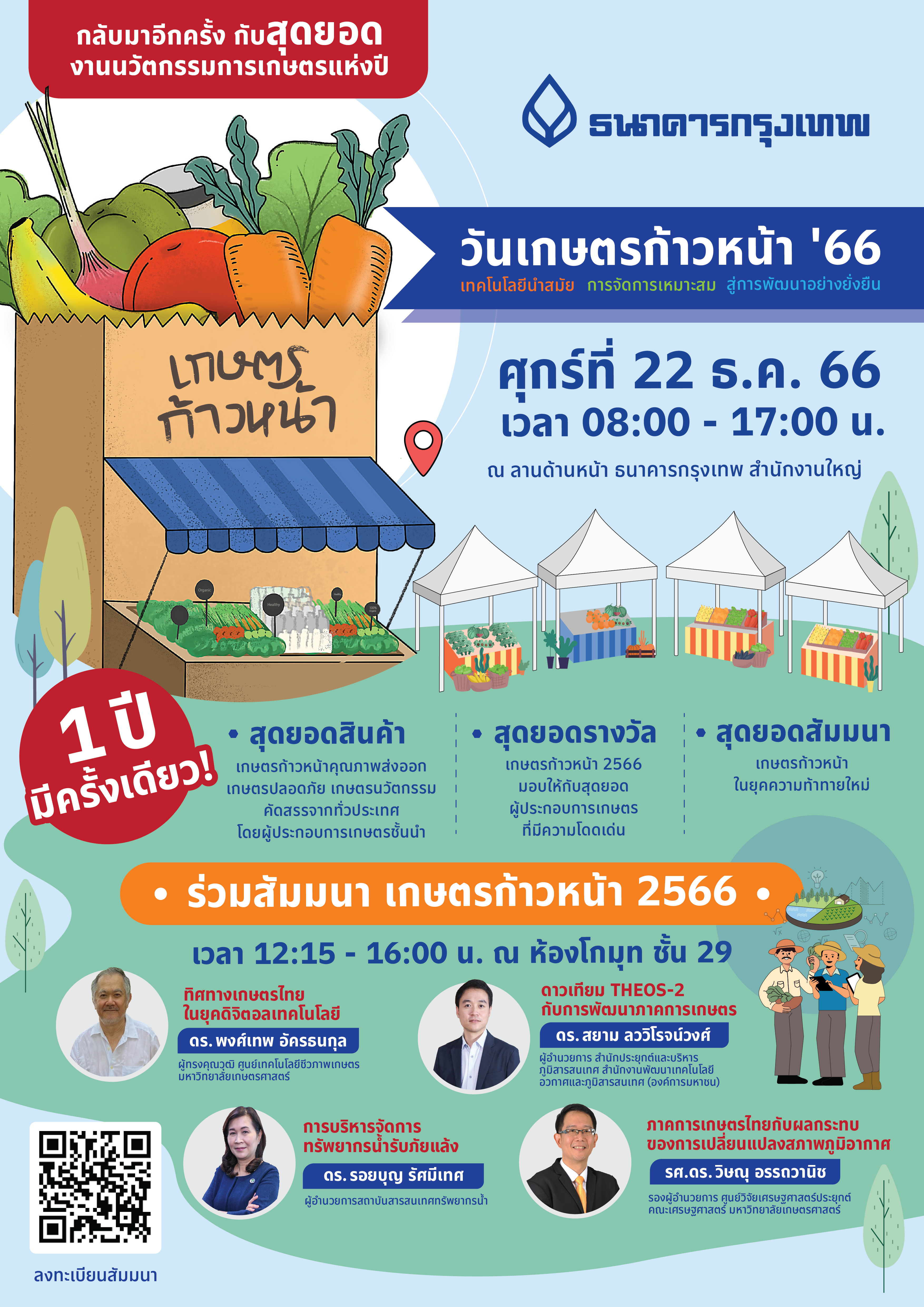ขอเชิญผู้สนใจ ร่วมช้อปสินค้าเกษตรคุณภาพ ในงาน “วันเกษตรก้าวหน้า ’66” วันศุกร์ที่ 22 ธันวาคม 2566 ณ ลานด้านหน้าธนาคารกรุงเทพ สำนักงานใหญ่ ถนนสีลม โดยบูธร้านค้าจะเริ่มเปิดให้บริการตั้งแต่เวลา 08.00 – 17.30 น. และ ช่วงงานสัมมนาพิเศษ เวลา 13.00 – 16.00 น. ณ ห้องโกมุท ชั้น 29 ธนาคารกรุงเทพ สำนักงานใหญ่ โดยสามารถสแกนคิวอาร์โค้ด เพื่อลงทะเบียนเข้าร่วมงานสัมมนาฯ (มีจำนวนจำกัด) ได้ตั้งแต่วันนี้! สอบถามรายละเอียดเพิ่มเติมที่ จิรารัตน์ ประเสริฐกิจ โทร. 02-230-9517 หรือ พรปรียา ต่อเทียนชัย โทร. 02-230-9671