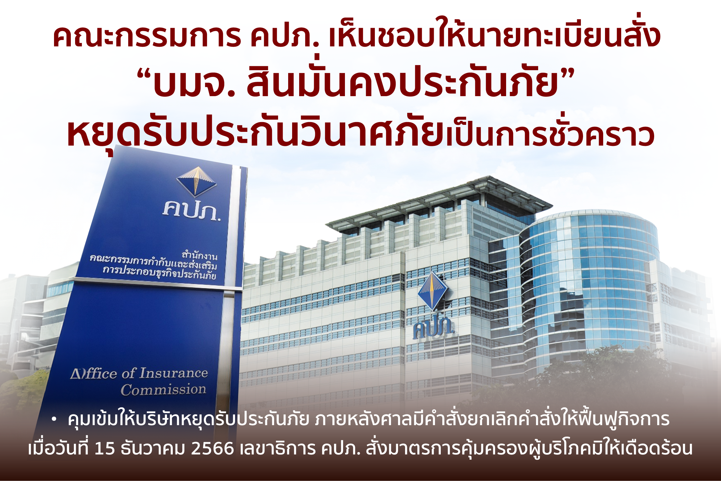 คณะกรรมการ คปภ. พิจารณาจากพฤติการณ์และหลักฐานต่าง ๆ ดังกล่าวโดยละเอียดแล้ว เพื่อป้องกันมิให้เกิดความเสียหายต่อผู้เอาประกันภัยและประชาชน จึงเห็นชอบให้นายทะเบียนใช้อำนาจตามมาตรา 52 วรรคหนึ่ง แห่งพระราชบัญญัติประกันวินาศภัย พ.ศ. 2535 ซึ่งแก้ไขเพิ่มเติมโดยพระราชบัญญัติประกันวินาศภัย (ฉบับที่ 2) พ.ศ. 2551 สั่งให้บริษัท สินมั่นคงประกันภัย จำกัด (มหาชน) หยุดรับประกันวินาศภัยเป็นการชั่วคราว ตามคำสั่งนายทะเบียนที่ 48/2566 เรื่อง ให้บริษัท สินมั่นคงประกันภัย จำกัด (มหาชน) หยุดรับประกันวินาศภัยเป็นการชั่วคราว ตามมาตรา 52 วรรคหนึ่งแห่งพระราชบัญญัติประกันวินาศภัย พ.ศ. 2535 ซึ่งแก้ไขเพิ่มเติมโดยพระราชบัญญัติประกันวินาศภัย (ฉบับที่ 2) พ.ศ. 2551 ลงวันที่ 15 ธันวาคม 2566