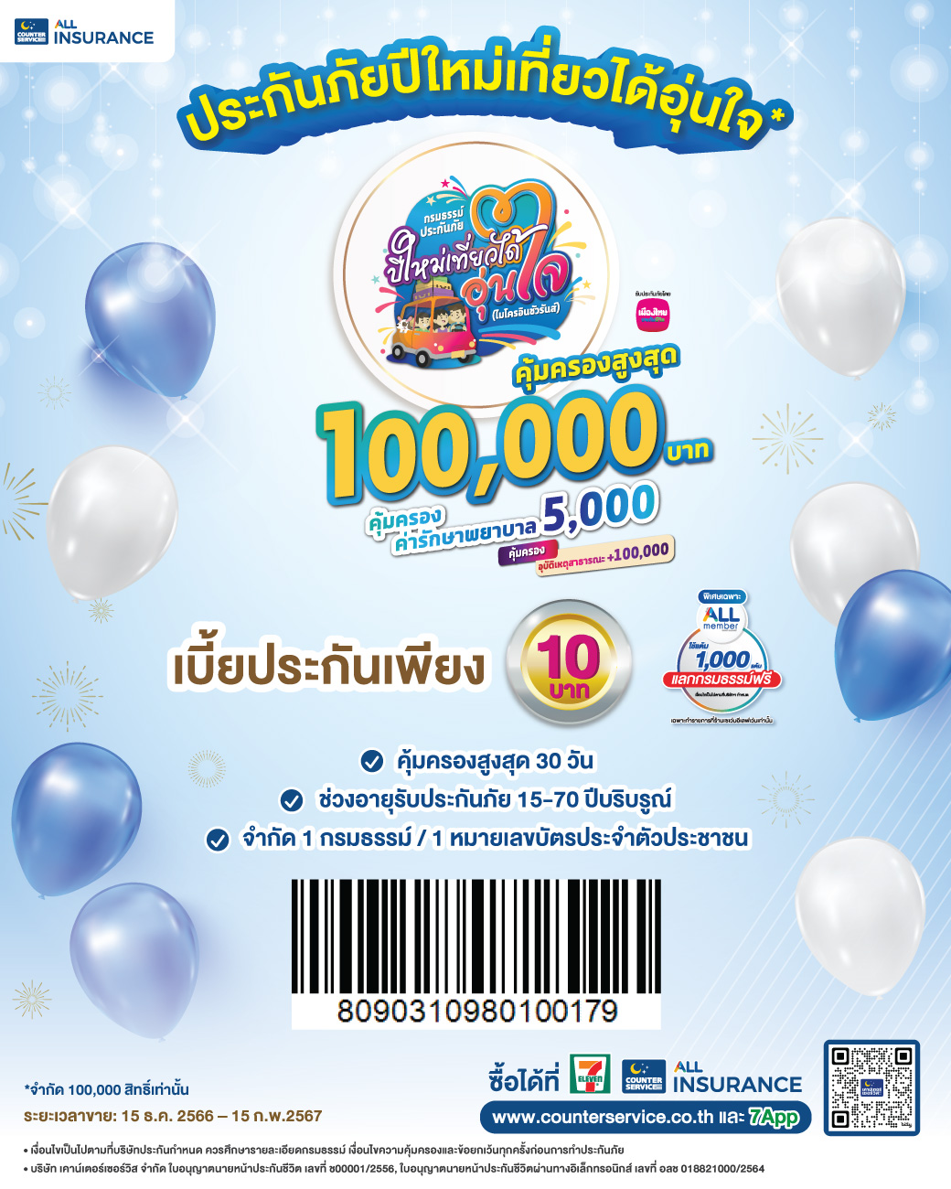 รับฟรี! กรมธรรม์ประกันภัยกลุ่มปีใหม่เที่ยวได้อุ่นใจ (ไมโครอินชัวรันส์) ในรูปแบบ QR Code ท้ายใบเสร็จ สำหรับลงทะเบียนผ่านไลน์ Counterservice รับกรมธรรม์คุ้มครองได้ทันที และสำหรับลูกค้าทั่วไปที่สนใจ สามารถซื้อกรมธรรม์ประกันภัยกลุ่มปีใหม่เที่ยวได้ อุ่นใจ (ไมโครอินชัวรันส์) ในราคาคุ้มค่าเพียงในราคา 10 บาท หรือใช้ 1,000 คะแนน ALL member แลกได้ ผ่านช่องทางที่สะดวกและครอบคลุม มีจุดบริการเข้าถึงได้ในทุกชุมชนที่เคาน์เตอร์เซอร์วิส ในร้านเซเว่นอีเลฟเว่น และช่องทางออนไลน์ กรอกข้อมูลบนเว็บไซต์ www.counterservice.co.th, Counter Service Application หรือ 7App ให้ประชาชนหมดความกังวล พร้อมเฉลิมฉลองและมีความสุขตลอดการพักผ่อนในเทศกาลปีใหม่นี้