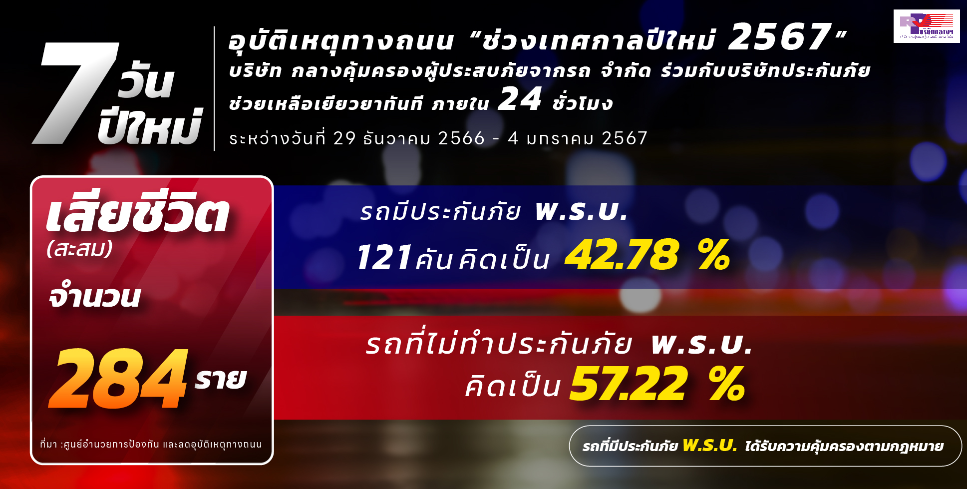 5 มกราคม 2567 : ตามที่ศูนย์อำนวยการป้องกันและลดอุบัติเหตุทางถนน ได้สรุปสถิติอุบัติเหตุทางถนนในช่วงเทศกาลปีใหม่ 2567 “ขับขี่ปลอดภัย เมืองไทยไร้อุบัติเหตุ” ตลอด 7 วัน ระหว่างวันที่ 29 ธันวาคม 2566 ถึงวันที่ 4 มกราคม 2567 พบว่ามีการเกิดอุบัติเหตุ รวม 2,288 ครั้ง ผู้เสียชีวิต 284 ราย ผู้บาดเจ็บ 2,307 คน โดยสาเหตุหลักที่ทำให้เกิดอุบัติเหตุ ได้แก่ ขับรถเร็วเกินกว่ากฎหมายกำหนด,ดื่มแล้วขับ และรถจักรยานยนต์เป็นพาหนะที่เกิดอุบัติเหตุสูงสุดถึงร้อยละ 86.30