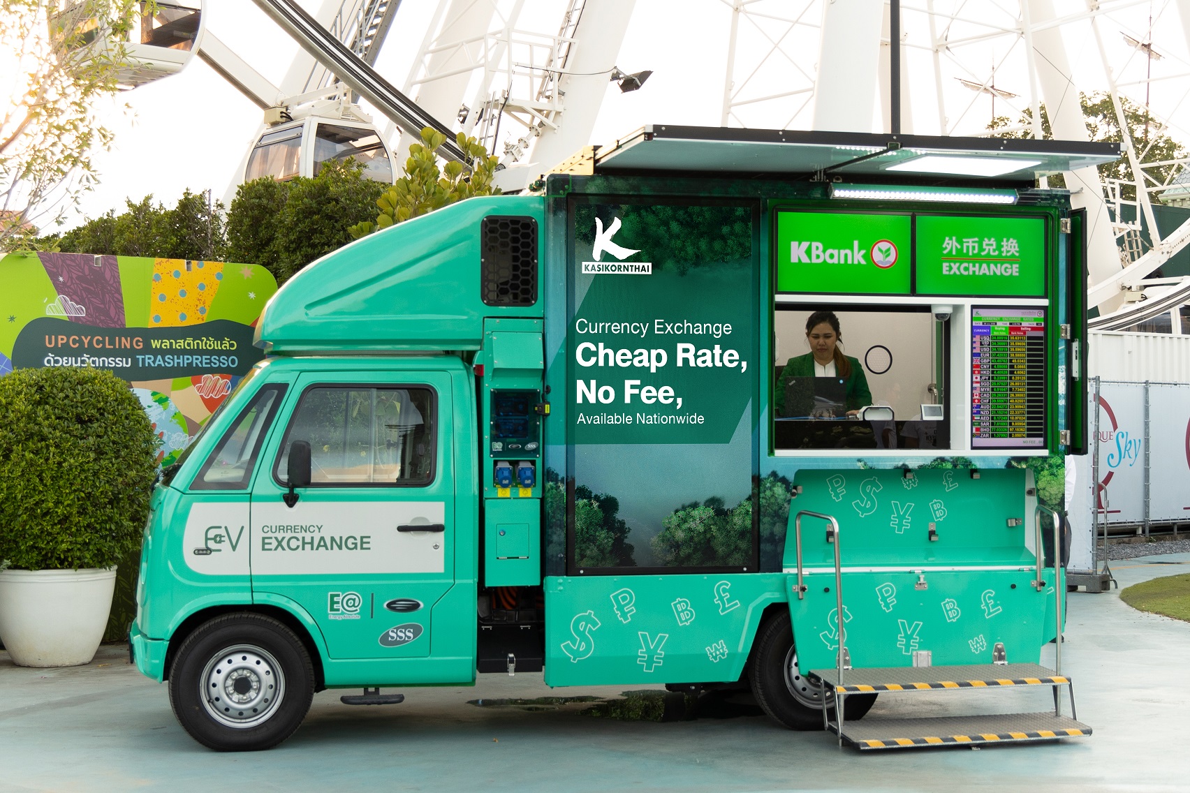 สำหรับรถ EV Currency Exchange เป็นรถแลกเปลี่ยนเงินตราต่างประเทศที่ขับเคลื่อนด้วยพลังงานไฟฟ้า 100% ขับเคลื่อนได้สูงสุด 120 กิโลเมตรต่อการชาร์จ 1 ครั้ง และใช้แบตเตอรี่ที่ได้พลังงานจากแผงโซลาร์ที่ติดตั้งบริเวณหลังคารถสำหรับการให้บริการแลกเปลี่ยนเงินตราในรถได้ต่อเนื่องสูงสุด 10 ชั่วโมงโดยไม่ต้องเสียบปลั๊กไฟ ปัจจุบันนำร่องเพิ่มความสะดวกสบายในการให้บริการแลกเงินแก่นักท่องเที่ยวในแหล่งท่องเที่ยวต่างๆ ทั้งในกรุงเทพฯ และต่างจังหวัด โดยเริ่มที่ จ.ภูเก็ต เป็นจังหวัดแรก และมีแผนขยายจำนวนรถให้ครอบคลุมมากขึ้นในอนาคต
