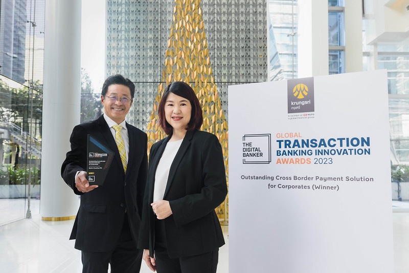 กรุงเทพฯ, 12 มกราคม 2567 : กรุงศรี (ธนาคารกรุงศรีอยุธยา จำกัด (มหาชน)) นำโดย นิลวรรณ จีระบุญ (ขวา) ประธานคณะเจ้าหน้าที่ด้านธุรกรรมการเงิน และ พิธา ตัณฑ์ไพโรจน์ (ซ้าย) ผู้อำนวยการอาวุโส ผู้บริหารสายงานพัฒนาผลิตภัณฑ์ธุรกรรมการเงิน รับรางวัลชนะเลิศ Winner – Outstanding Cross Border Payment Solution for Corporates จากงาน Global Transaction Banking Innovation Awards 2023