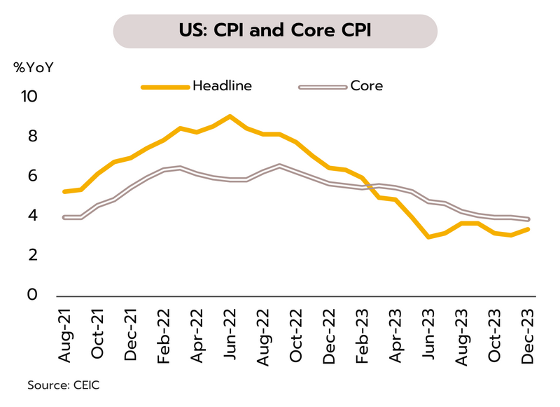17 มกราคม 2567 : สหรัฐฯ มีเงินเฟ้อที่สูงกว่าคาดภายใต้ตลาดแรงงานที่ยังคงแข็งแกร่งสร้างความไม่แน่นอนต่อไทม์ไลน์การปรับลดอัตราดอกเบี้ยของเฟดในช่วง 1H67 ในเดือนธันวาคมอัตราเงินเฟ้อผู้บริโภคทั่วไปเพิ่มขึ้น 3.4% YoY และ 0.3% MoM จากเดือนก่อนที่ 3.1% และ 0.1% ตามลำดับ ส่วนอัตราเงินเฟ้อผู้บริโภคพื้นฐานอยู่ที่ 3.9% YoY และ 0.3% MoM จากเดือนก่อนที่ 4.0% และ 0.3% ตามลำดับ