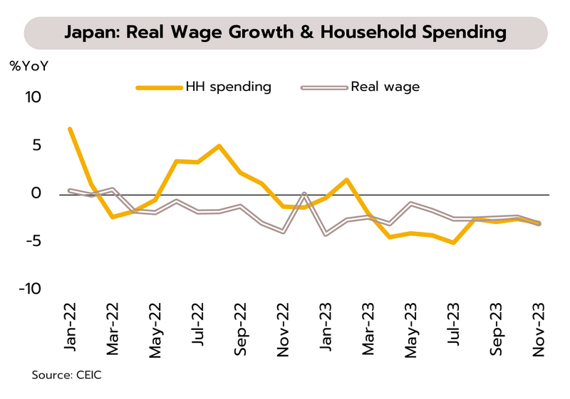 ทางด้านประเทศญี่ปุ่น เหตุแผ่นดินไหวรุนแรงในญี่ปุ่นรวมถึงความเสี่ยง recession ลดโอกาสที่ BOJ จะยกเลิกนโยบายดอกเบี้ยติดลบในไตรมาส 1 ในเดือนพฤศจิกายน การใช้จ่ายภาคครัวเรือนหดตัวลงติดต่อกันเป็นเดือนที่ 9 อยู่ที่ -2.9% YoY สอดคล้องกับตัวเลขรายได้แท้จริงที่หดตัวต่อเนื่องเป็นเดือนที่ 20 ที่ -3.0% YoY ขณะที่ในเดือนธันวาคม อัตราเงินเฟ้อทั่วไปชะลอลงสู่ระดับ 2.4% YoY จากเดือนก่อนที่ 2.7% ส่วนอัตราเงินเฟ้อพื้นฐานชะลอลงสู่ระดับ 2.1% YoY จากเดือนก่อนที่ 2.3% เนื่องจากเศรษฐกิจญี่ปุ่นมีความเสี่ยงมากขึ้นที่จะเข้าสู่ภาวะถดถอย (recession) ในไตรมาส 4/67 สะท้อนจาก