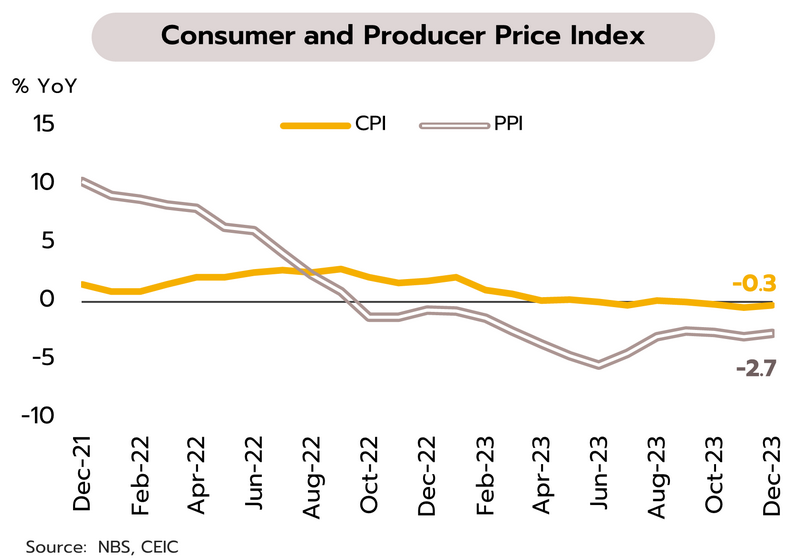 ส่วนประเทศจีน ความเสี่ยงต่อภาวะเงินฝืดในจีนมีแนวโน้มเพิ่มมากขึ้น ขณะที่ผลการเลือกตั้งในไต้หวันอาจทำให้ความตึงเครียดทางภูมิรัฐศาสตร์ดำเนินต่อไป ดัชนีราคาผู้บริโภคในเดือนธันวาคมยังคงปรับตัวลง 0.3% YoY และเป็นการลดลงอย่างต่อเนื่องติดต่อกันเป็นเดือนที่สาม อย่างไรก็ตาม ดัชนีราคาผู้บริโภคเฉพาะภาคบริการปรับตัวสูงขึ้นที่ 1% YoY สอดคล้องกับ PMI ภาคบริการที่ยังอยู่ในทิศทางการขยายตัวในเดือนธันวาคม (Official: 50.4, Caixin: 52.9)