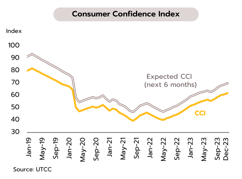 ในช่วงต้นปีคาดว่าการบริโภคจะยังเติบโตได้อย่างต่อเนื่อง ปัจจัยบวกจากความเชื่อมั่นและตลาดแรงงานที่ปรับดีขึ้น สะท้อนจากอัตราการว่างงานที่อยู่ในระดับต่ำที่ 1% ใกล้เคียงกับช่วงก่อนเกิดการระบาด รวมถึงภาคท่องเที่ยวที่ยังฟื้นตัวต่อเนื่องจากปัจจัยสนับสนุนของมาตรการยกเว้นการตรวจลงตรา (Visa-Free) และยังมีมาตรการกระตุ้นการใช้จ่ายผ่านโครงการ Easy-E-Receipt (ใช้สิทธิลดหย่อนภาษีเงินได้บุคคลธรรมดาสำหรับการซื้อสินค้าหรือบริการมูลค่าสูงสุด 50,000 บาท ตั้งแต่วันที่ 1 มกราคม ถึง 15 กุมภาพันธ์ 2567) ซึ่งเบื้องต้นทางการประเมินว่ามาตรการดังกล่าวจะส่งผลให้มีเม็ดเงินเข้าสู่ระบบเศรษฐกิจราว 70,000 ล้านบาท ช่วยหนุน GDP เพิ่มขึ้น 0.18%
