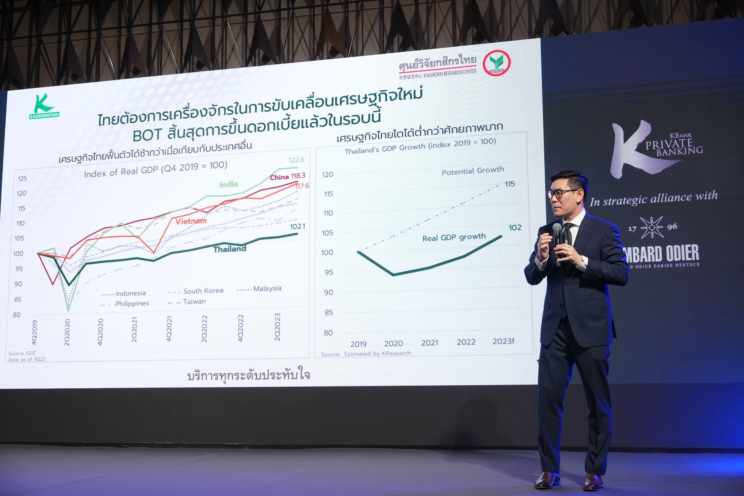 นายบุรินทร์ อดุลวัฒนะ กรรมการผู้จัดการ และ Chief Economist ศูนย์วิจัยกสิกรไทย กล่าวว่า ในปี 2567 เศรษฐกิจไทยน่าจะเติบโตได้ราว 3.1% หนุนจากการลงทุนภาครัฐ การบริโกคภาคเอกชน และการส่งออกสินค้าที่คาดว่าขยายตัว 2% รวมถึงจำนวนนักท่องเที่ยวที่น่าจะเพิ่มขึ้นมาอยู่ที่ 30.6 ล้านคน ทั้งนี้ หากมีมาตรการดิจิทัลวอลเล็ตอาจทำให้เศรษฐกิจไทยขยายตัวได้เพิ่มเป็น 3.6% อย่างไรก็ตาม มองว่าไทยต้องการเครื่องจักรใหม่ เพื่อขับเคลื่อนเศรษฐกิจไทยให้เติบโตไปสู่ระดับศักยภาพในระยะยาว เช่น อุตสาหกรรมรถยนต์ไฟฟ้า โอกาสจากการย้ายฐานการผลิตออกจากจีน เป็นต้น