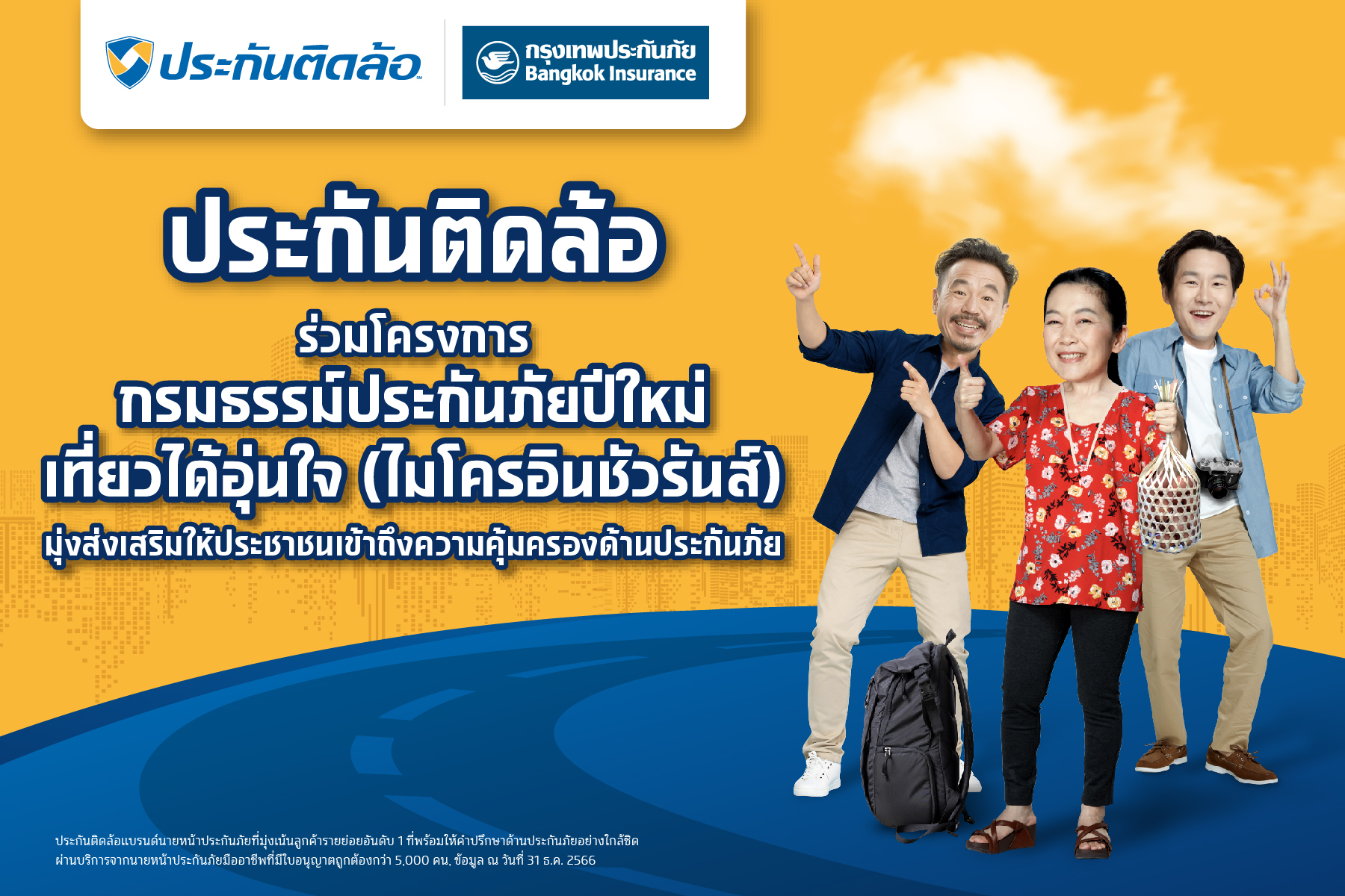 19 มกราคม 2567 : “ประกันติดล้อ” นายหน้าประกันภัยเพื่อลูกค้ารายย่อยอันดับ 1* ที่พร้อมให้คำปรึกษาด้านประกันภัยอย่างใกล้ชิด (Face to Face Marketing) จากนายหน้าประกันภัยมืออาชีพกว่า 5,000 คน ทั่วประเทศ โดย บริษัท เงินติดล้อ จำกัด (มหาชน) ร่วมสนับสนุนโครงการ “กรมธรรม์ประกันภัย ปีใหม่เที่ยวได้อุ่นใจ (ไมโครอินชัวรันส์)” จัดโดย สำนักงาน คปภ. เพื่อร่วมส่งเสริมความคุ้มครองด้านประกันภัยให้กับประชาชนในช่วงเทศกาลปีใหม่ 2567 ที่ผ่านมา เป็นการบรรเทาค่าใช้จ่ายและความสูญเสียที่อาจเกิดขึ้นจากอุบัติเหตุหรือเหตุการณ์ไม่คาดคิด รับประกันภัยโดย บริษัท กรุงเทพประกันภัย จำกัด (มหาชน) เพื่อส่งเสริมให้ประชนเข้าถึงความคุ้มครองด้านประกันภัยเพิ่มขึ้นอีกด้วย
