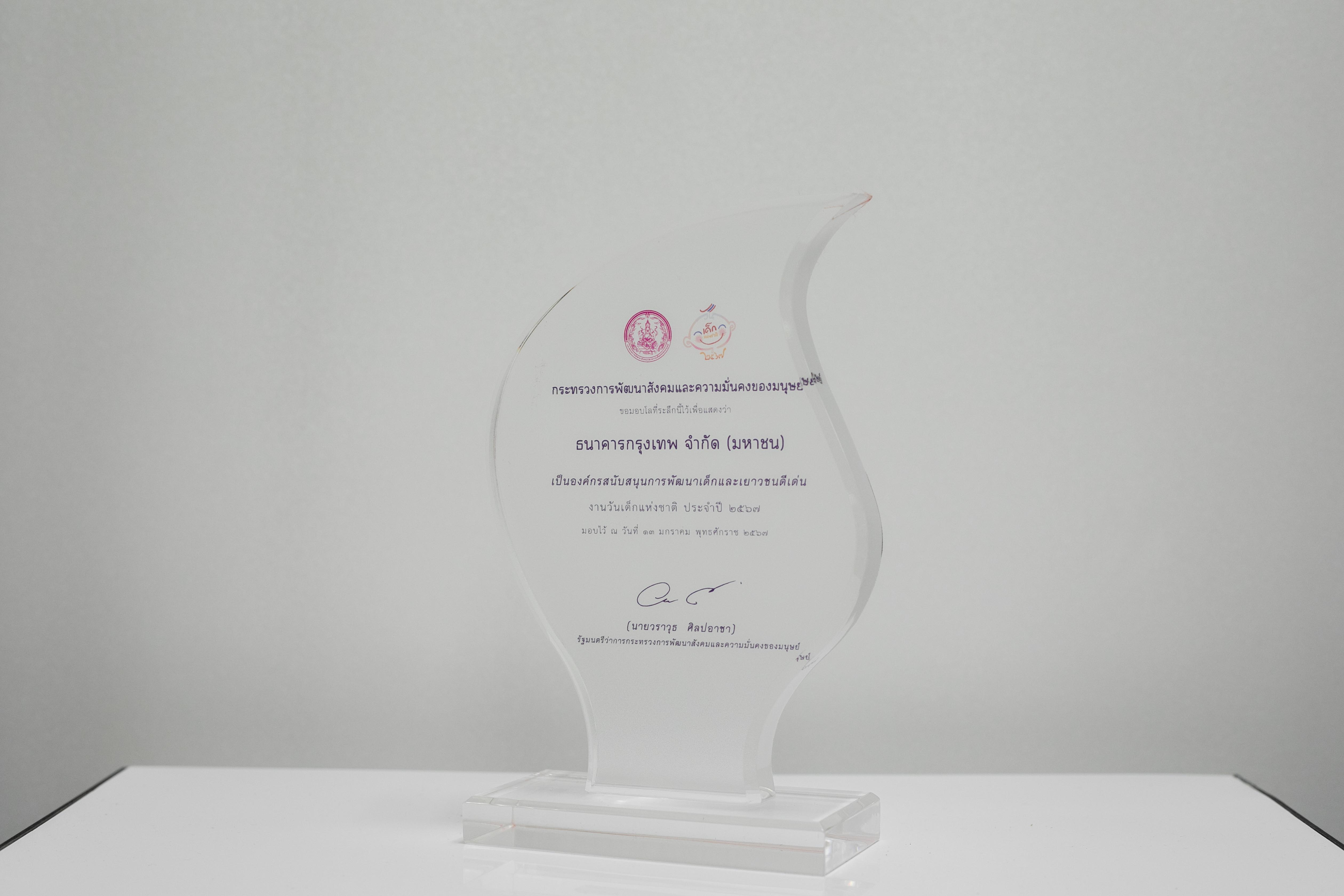 26 มกราคม 2567 : ธนาคารกรุงเทพ จำกัด (มหาชน) โดยนางสาวดวงกมล พันธ์แก้ว เจ้าหน้าที่บริหารระดับ Vice President บริหารความสัมพันธ์และการขาย สายลูกค้าบุคคล เป็นตัวแทนธนาคาร เข้ารับรางวัล องค์กรสนับสนุนการพัฒนาเด็กและเยาวชนดีเด่น งานวันเด็กแห่งชาติ ประจำปี 2567 จากนายวราวุธ ศิลปอาชา รัฐมนตรีว่าการกระทรวงการพัฒนาสังคมและความมั่นคงของมนุษย์ ที่กระทรวงการพัฒนาสังคมและความมั่นคงของมนุษย์ เมื่อเร็วๆ นี้