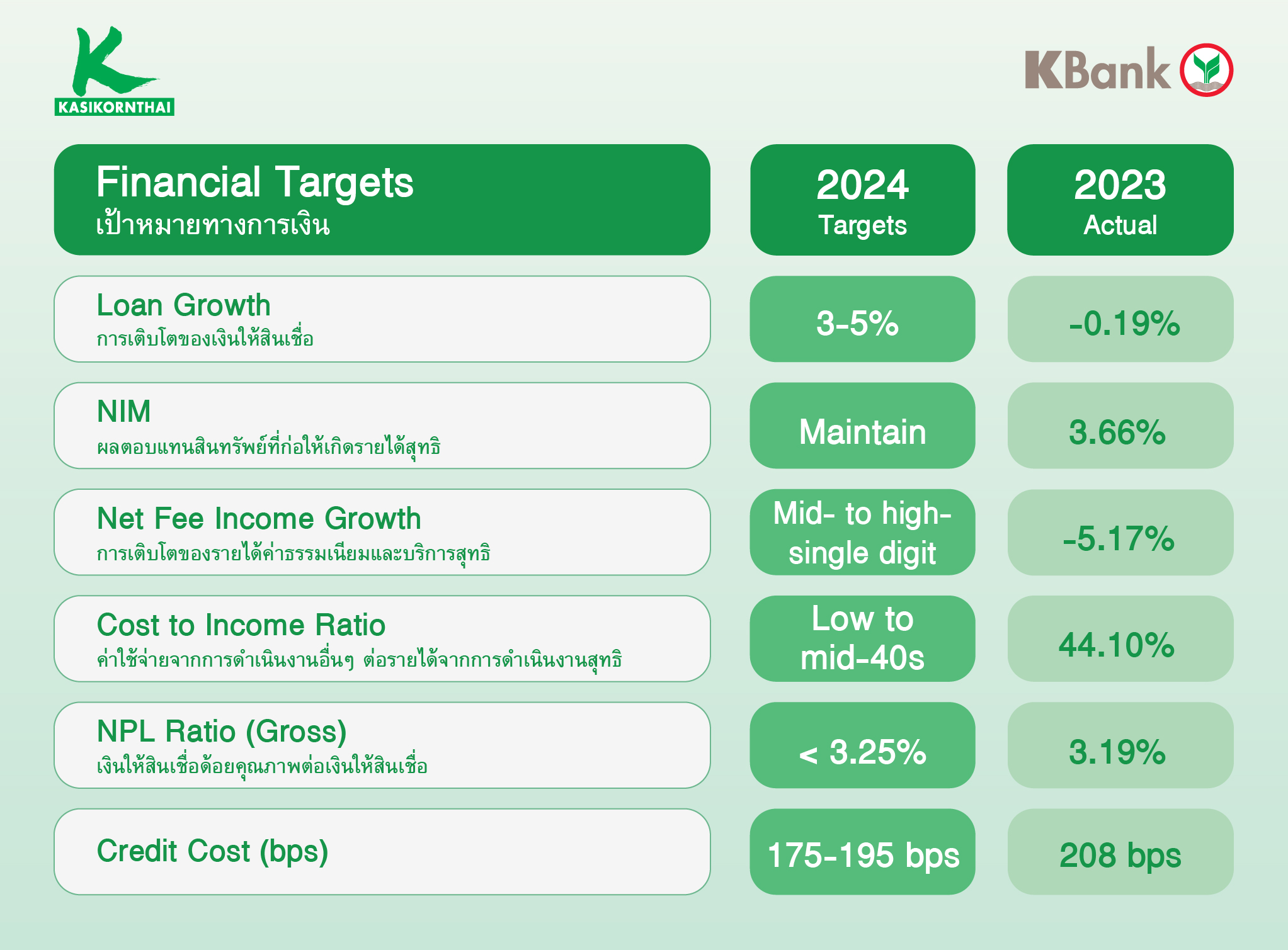 • รายได้ค่าธรรมเนียมและบริการสุทธิ (Net Fee Income Growth) เติบโตที่ Mid to high-single Digit ผ่านการสร้างความมั่งคั่งอย่างยั่งยืนให้กับลูกค้า ในขณะที่รายได้ค่าธรรมเนียมรับจากการทำธุรกรรมลดลงจากพฤติกรรมผู้บริโภคที่เปลี่ยนแปลง