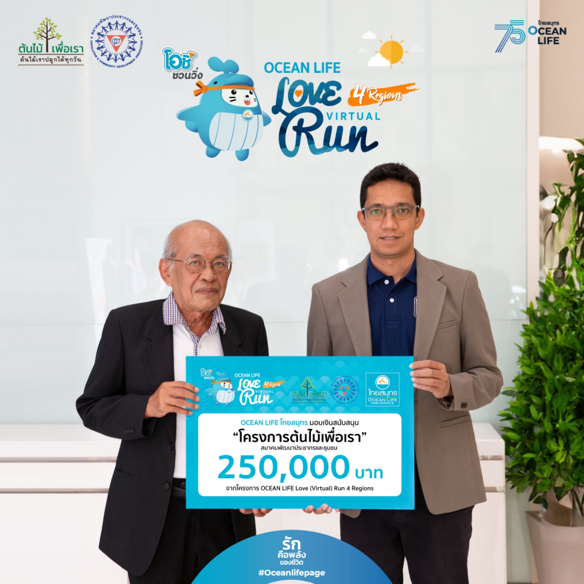 2 กุมภาพันธ์ 2567 : บมจ.ไทยสมุทรประกันชีวิต รักคือพลังของชีวิต โดยคุณระวิน มุคขจี Vice President Customer Experience Management เป็นผู้แทนบริษัทฯ มอบเงินจำนวน 250,000 บาท จากกิจกรรม “OCEAN LIFE LOVE (Virtual) RUN 4 Regions ทุกก้าว เท่ากับให้ ภาคอีสาน” ซึ่งเป็นภูมิภาคสุดท้ายของโครงการ ที่บริษัทจะนำระยะทางเดิน/วิ่งจากผู้ร่วมกิจกรรมทุก ๆ 1 กิโลเมตร เปลี่ยนเป็นเงินบริจาค โดยในครั้งสุดท้ายนี้มอบให้แก่ “โครงการต้นไม้เพื่อเรา” โดยมีคุณวิลาส เตโช ผู้อำนวยการสมาคมพัฒนาประชากรและชุมชน ผู้ริเริ่มโครงการต้นไม้เพื่อเราเป็นผู้รับมอบ เพื่อนำไปปลูกป่าสร้างพื้นที่สีเขียว ช่วยลดปัญหาของสภาวะอากาศ สร้างสิ่งแวดล้อมที่ยั่งยืน OCEAN LIFE ไทยสมุทร ขอขอบคุณลูกค้าทุกท่านที่เข้าร่วมกิจกรรมในครั้งนี้ ที่ได้เปลี่ยนก้าวเป็นเงินบริจาค เพื่อสร้างโลกใหม่ที่สวยงามไปกับเรา