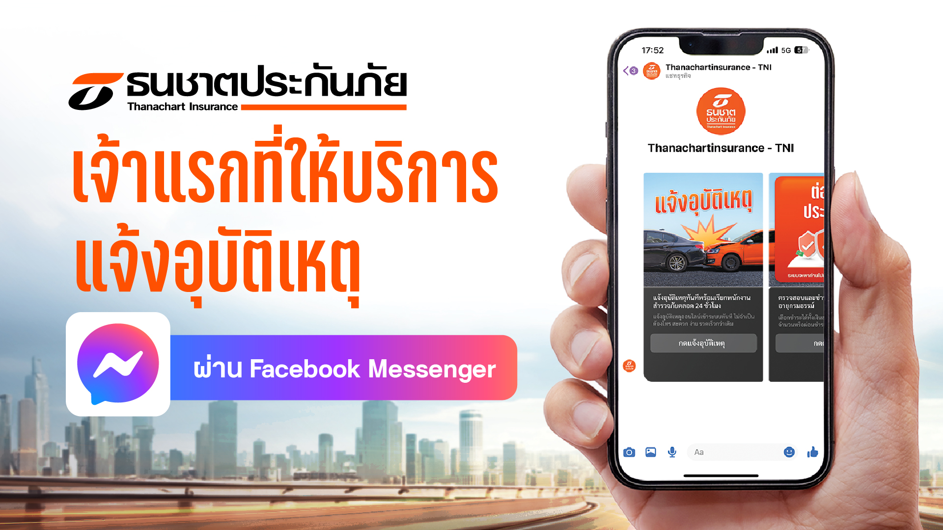 โดย ช่องทางบริการผ่านแพลตฟอร์ม Facebook Messenger นี้พัฒนาขึ้นมาเพื่อให้ลูกค้าสะดวกและมีทางเลือกในการใช้บริการได้ง่ายขึ้น ซึ่งมีทั้งการให้แจ้งอุบัติเหตุง่ายๆ เพียงแค่คลิกและแชทผ่าน Messenger ของ Facebook เพจ Thanachartinsurance - TNI โดยไม่ต้องเสียเวลาหาเบอร์ติดต่อ หรือรอสายโทรศัพท์ มีขั้นตอนการแจ้งอุบัติเหตุที่ทำเพียงไม่กี่ขั้นตอน และไม่ต้องกังวลกับปัญหาการบอกเส้นทางแจ้งจุดเกิดเหตุ และสามารถติดตามสถานะการเดินทางของเจ้าหน้าที่สำรวจภัยที่กำลังเดินทางมาให้บริการได้ตลอด