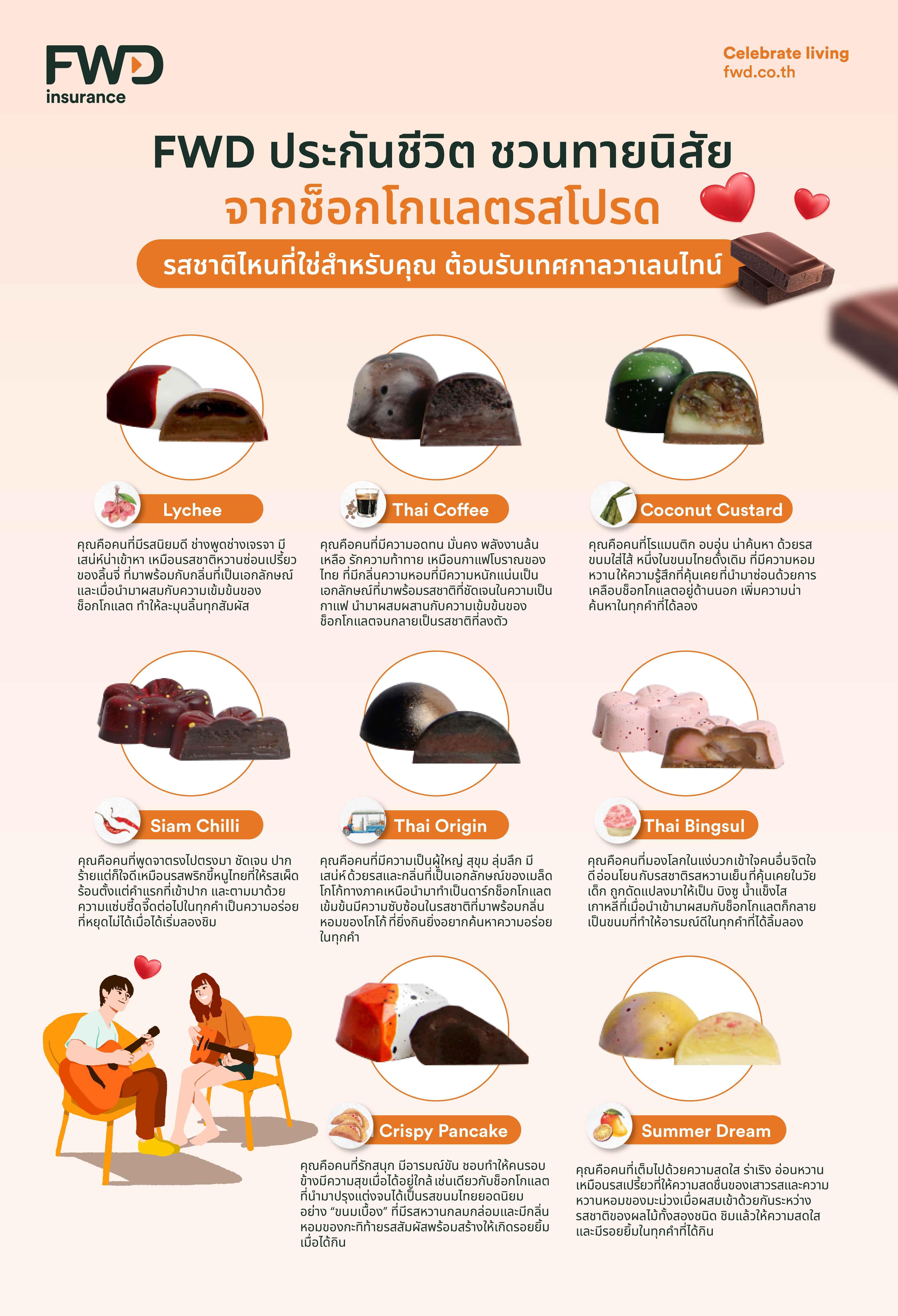 8 กุมภาพันธ์ 2567 : “ช็อกโกแลต” ของขวัญยอดฮิตที่เป็นสื่อแทนใจในการส่งความรัก และความปรารถนาดีที่มีให้กันในช่วงเทศกาลวันแห่งความรัก หรือวันวาเลนไทน์ ซึ่งเป็นวันที่หลายๆ คนให้ความสำคัญ โดยเฉพาะคู่รัก เพราะถือเป็นวันที่ได้มีโอกาสมอบของขวัญเพื่อแสดงความรู้สึกดีๆที่มีต่อกัน วันนี้ FWD ประกันชีวิต ชวนลูกค้าร่วมค้นหารสชาติ “ช็อกโกแลต” ในแบบที่ตรงใจ พร้อมสร้างประสบการณ์แบรนด์เอฟดับบลิวดีผ่านรสชาติของ Chocolate Bon Bon ทั้ง 8 รสชาติ ในคอลเลคชั่นสุดพิเศษ “Iconic taste of Thailand” ที่ได้ร่วมมือกับ The Chocolate Factory ร้านช็อกโกแลตระดับพรีเมียม หนึ่งในพาร์ทเนอร์ของการ Collaboration ล่าสุด มาดูกันซิว่ารสชาติช็อกโกแลตที่คุณชอบบอกอะไรเกี่ยวกับตัวตนคุณ