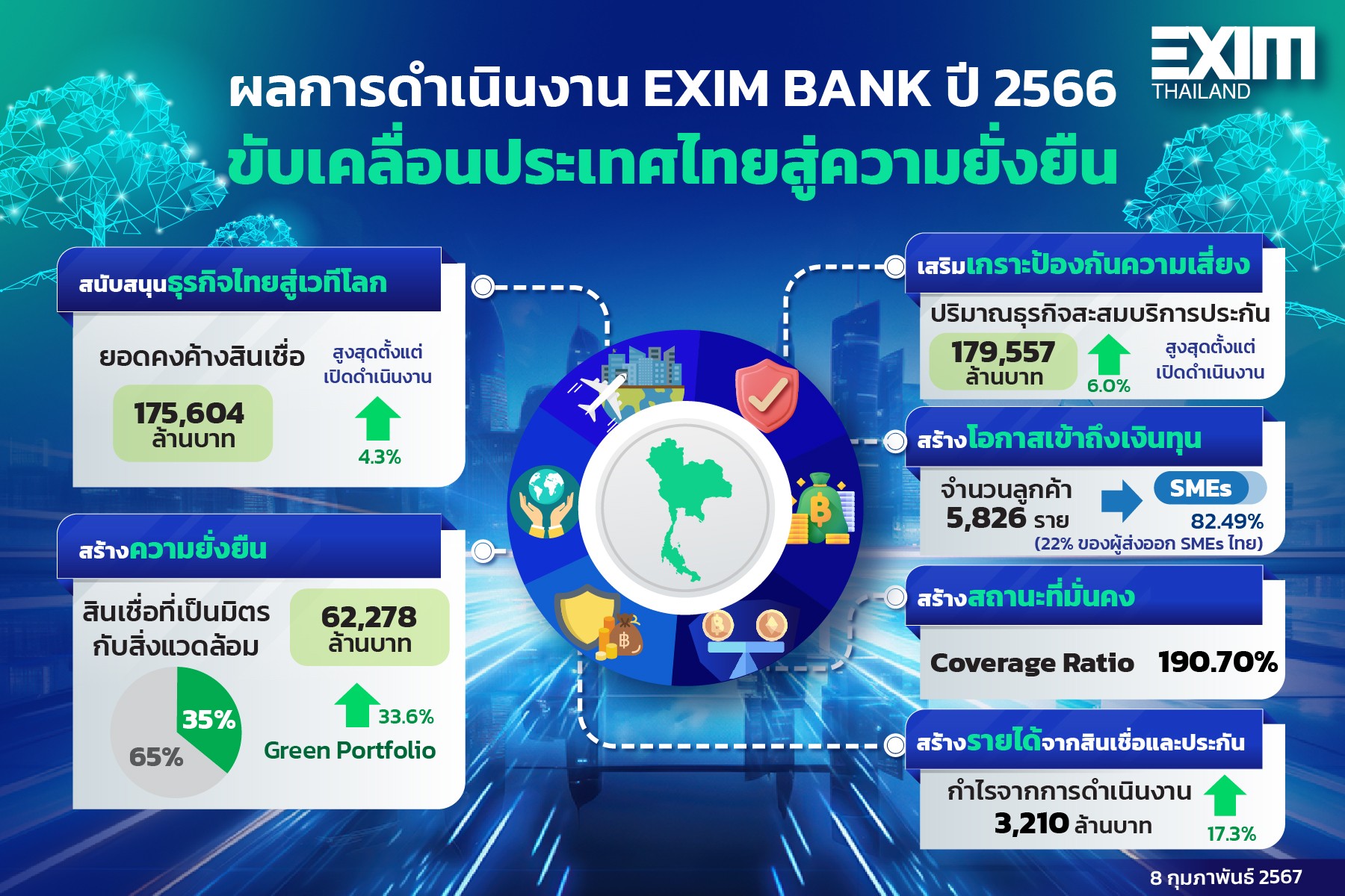 สำหรับผลการดำเนินงานในปี 2566 ที่ผ่านมา EXIM BANK มีวงเงินอนุมัติสินเชื่อใหม่ 70,628 ล้านบาท โดยเป็นวงเงินของผู้ประกอบการ SMEs จำนวน 10,792 ล้านบาท และมีสินเชื่อคงค้าง 175,604 ล้านบาท เพิ่มขึ้น 7,273 ล้านบาท หรือ 4.32% เมื่อเทียบกับปีก่อน สูงที่สุดตั้งแต่เปิดดำเนินงานในปี 2537 ทั้งนี้ กว่า 2 ใน 3 เป็นยอดคงค้างสินเชื่อเพื่อการลงทุนจำนวนรวม 120,970 ล้านบาท เพิ่มขึ้น 0.6% จากปีก่อน ตอกย้ำบทบาทธนาคารเพื่อการพัฒนา ซึ่งยกระดับเป็น “Green Development Bank” เพื่อส่งเสริมเศรษฐกิจไทยให้เข้มแข็ง ควบคู่กับการยกระดับการพัฒนาโครงสร้างพื้นฐานและอุตสาหกรรมในประเทศไทยและภูมิภาคเอเชีย-แปซิฟิกให้เติบโตสู่อนาคตที่ยั่งยืน โดยคำนึงถึงสิ่งแวดล้อม สังคม และการกำกับดูแลกิจการที่ดี (Environmental, Social, and Governance: ESG)