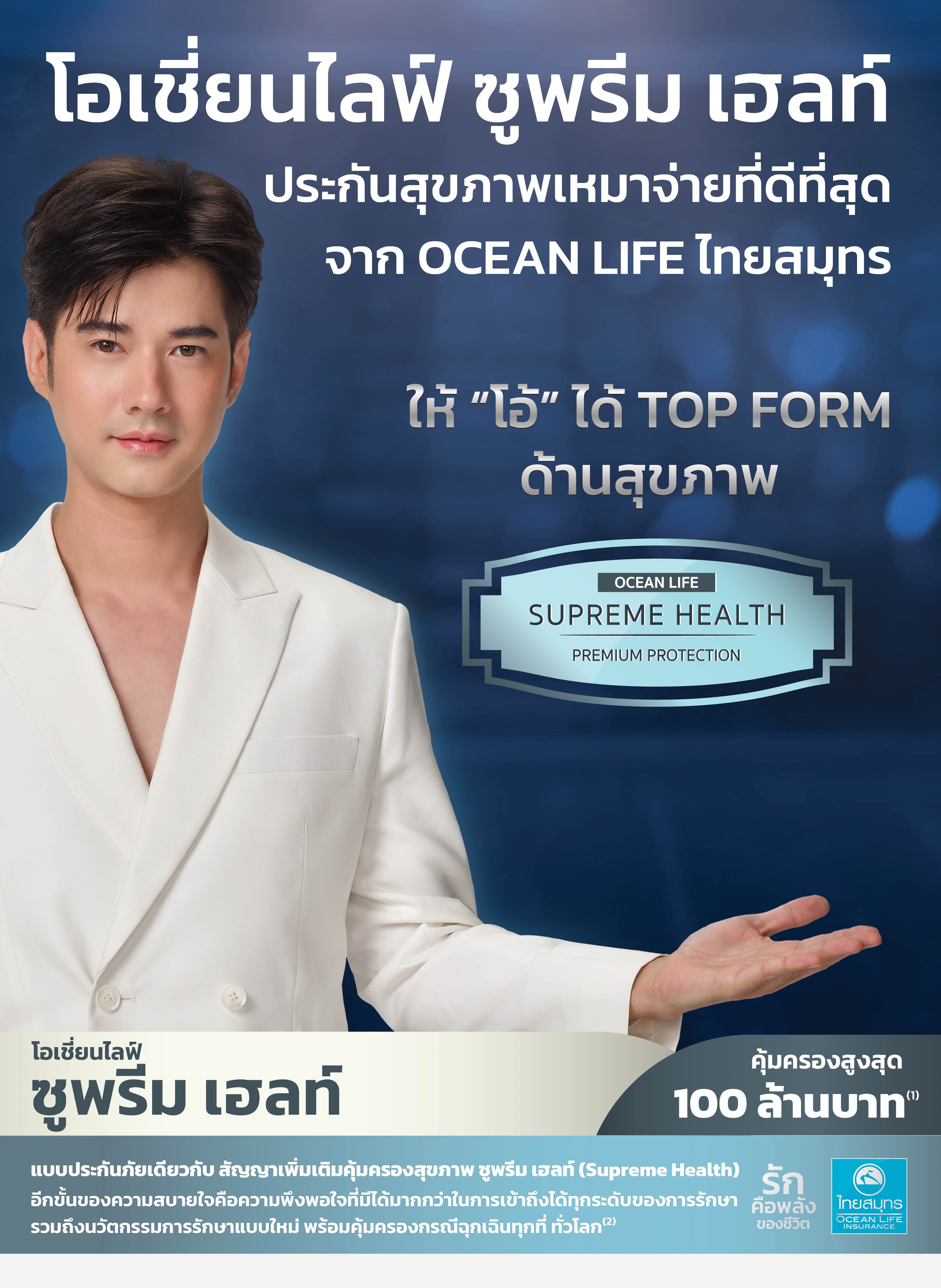 ทุกวันนี้มีนวัตกรรมทางการแพทย์เกิดขึ้นมากมาย ซึ่งสิ่งที่ตามมาก็คือค่ารักษาพยาบาลที่สูงขึ้น ด้วยเหตุนี้เอง OCEAN LIFE ไทยสมุทรจึงได้พัฒนา สัญญาเพิ่มเติม “โอเชี่ยนไลฟ์ ซูพรีม เฮลท์ (Supreme Health)” ให้เป็นประกันสุขภาพเหมาจ่ายที่ดีที่สุดจาก OCEAN LIFE ไทยสมุทร ด้วยความคุ้มครองสูงสุดถึง 100 ล้านบาท พร้อมรองรับลูกค้าระดับพรีเมียมให้สบายใจในทุกมิติ หมดห่วงเรื่องค่ารักษาพยาบาล สามารถเข้าถึงและใช้บริการได้ทุกระดับของการรักษาครอบคลุมถึงนวัตกรรมการรักษาแบบใหม่ ๆ ครบวงจร