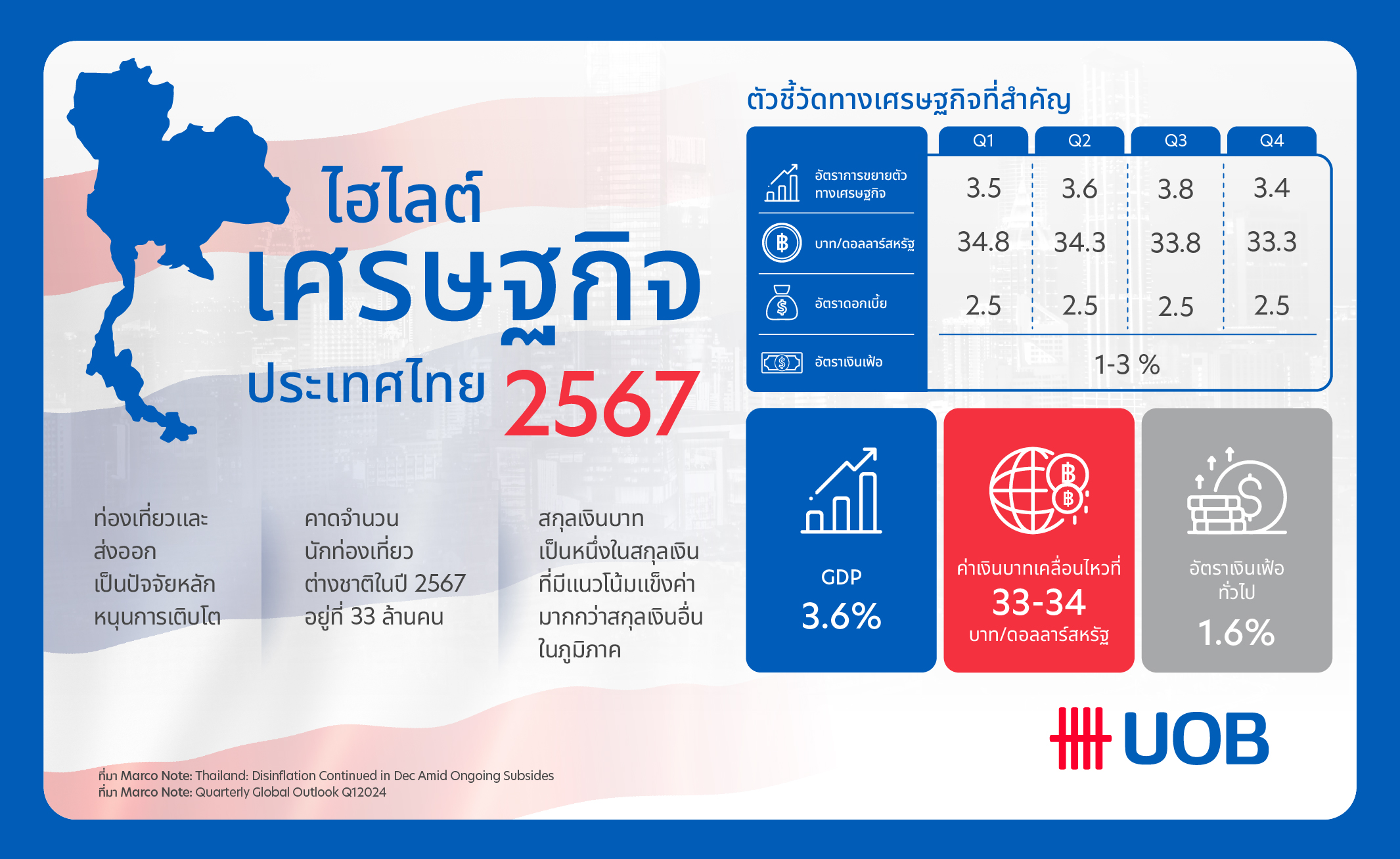 19 กุมภาพันธ์ 2567 : ธนาคารยูโอบี ประเทศไทย เปิดเผยรายงานวิเคราะห์สถานการณ์เศรษฐกิจของไทยในปี 2567 โดยประเมินว่าเศรษฐกิจไทยจะฟื้นตัวช้าในช่วงครึ่งปีแรก ก่อนที่จะขยายตัวได้แข็งแกร่งขึ้นในช่วงครึ่งปีหลัง ด้วยปัจจัยสนับสนุนจากมาตราการกระตุ้นทางการคลังของรัฐบาล ควบคู่ไปกับการฟื้นตัวของภาคท่องเที่ยวและส่งออก ธนาคารประเมินว่าอัตราการเติบโตทางเศรษฐกิจ หรือ จีดีพี (GDP) ของประเทศไทยมีแนวโน้มเติบโตได้ร้อยละ 3.6 ในปีนี้[1]