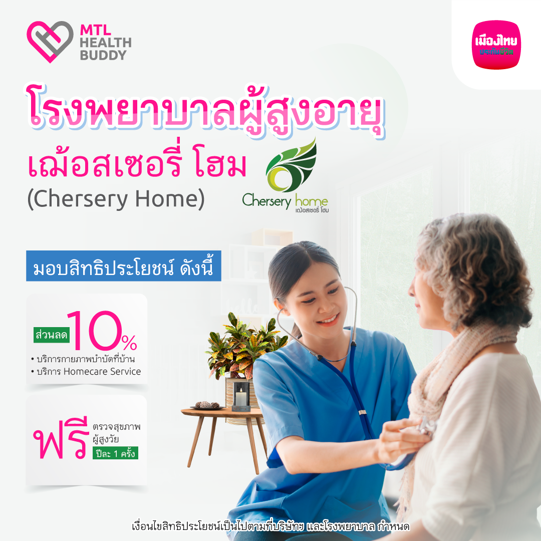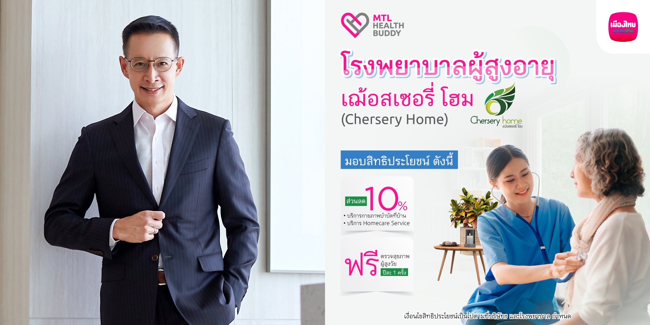 ล่าสุด เมืองไทยประกันชีวิต โดยโครงการ “MTL Health Buddy” จับมือ โรงพยาบาลผู้สูงอายุเฌ้อสเซอรี่ โฮม (Chersery Home) โรงพยาบาลเพื่อผู้สูงอายุที่พร้อมด้วยบริการและการดูแลอย่างครบวงจร ภายใต้แนวคิด Professional & Hospitality Decentralized Healthcare for ALL ร่วมเติมเต็มความอุ่นใจด้วยการมอบ สิทธิประโยชน์พิเศษให้กับลูกค้าในโครงการ MTL Health Buddyป ระกอบด้วย