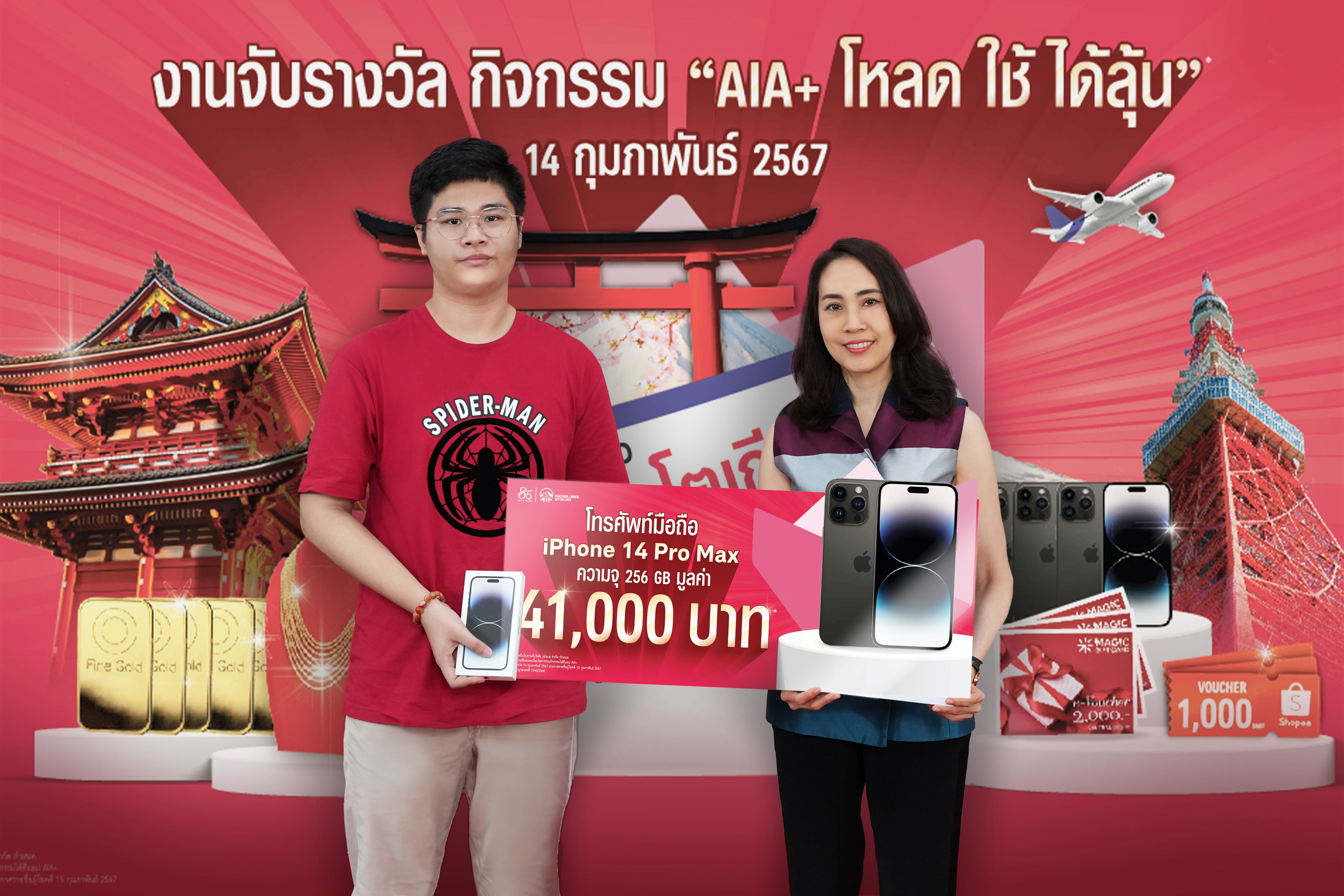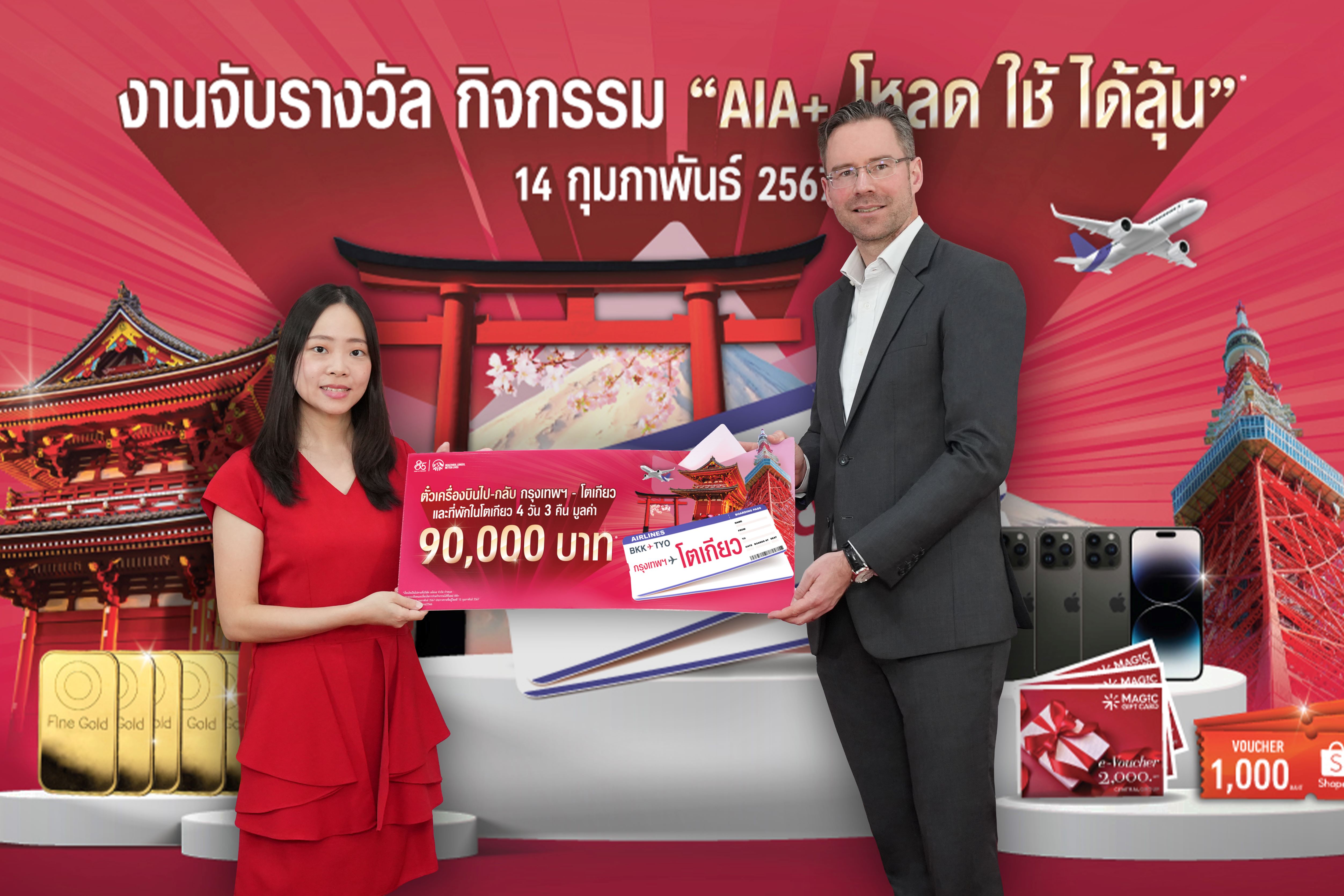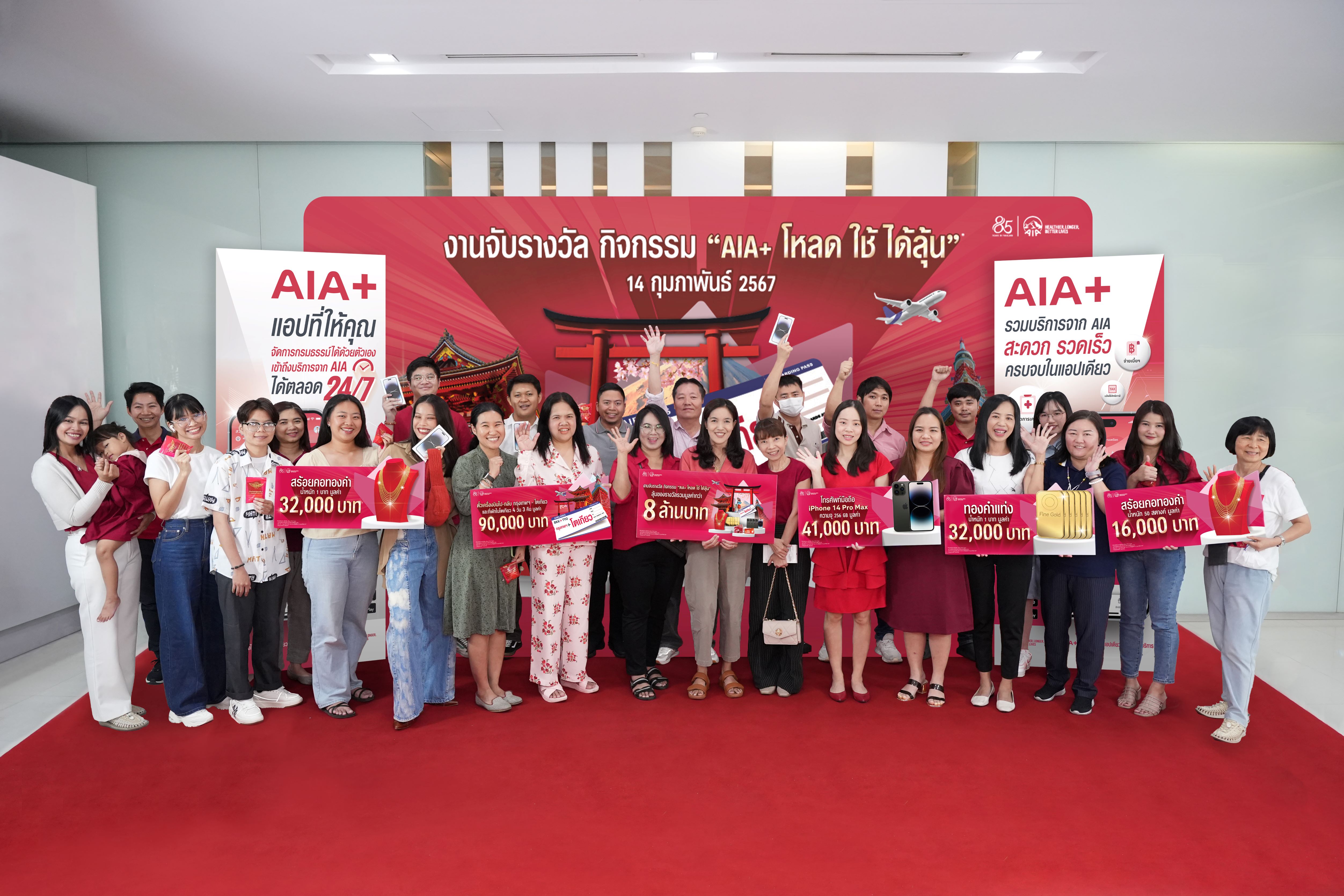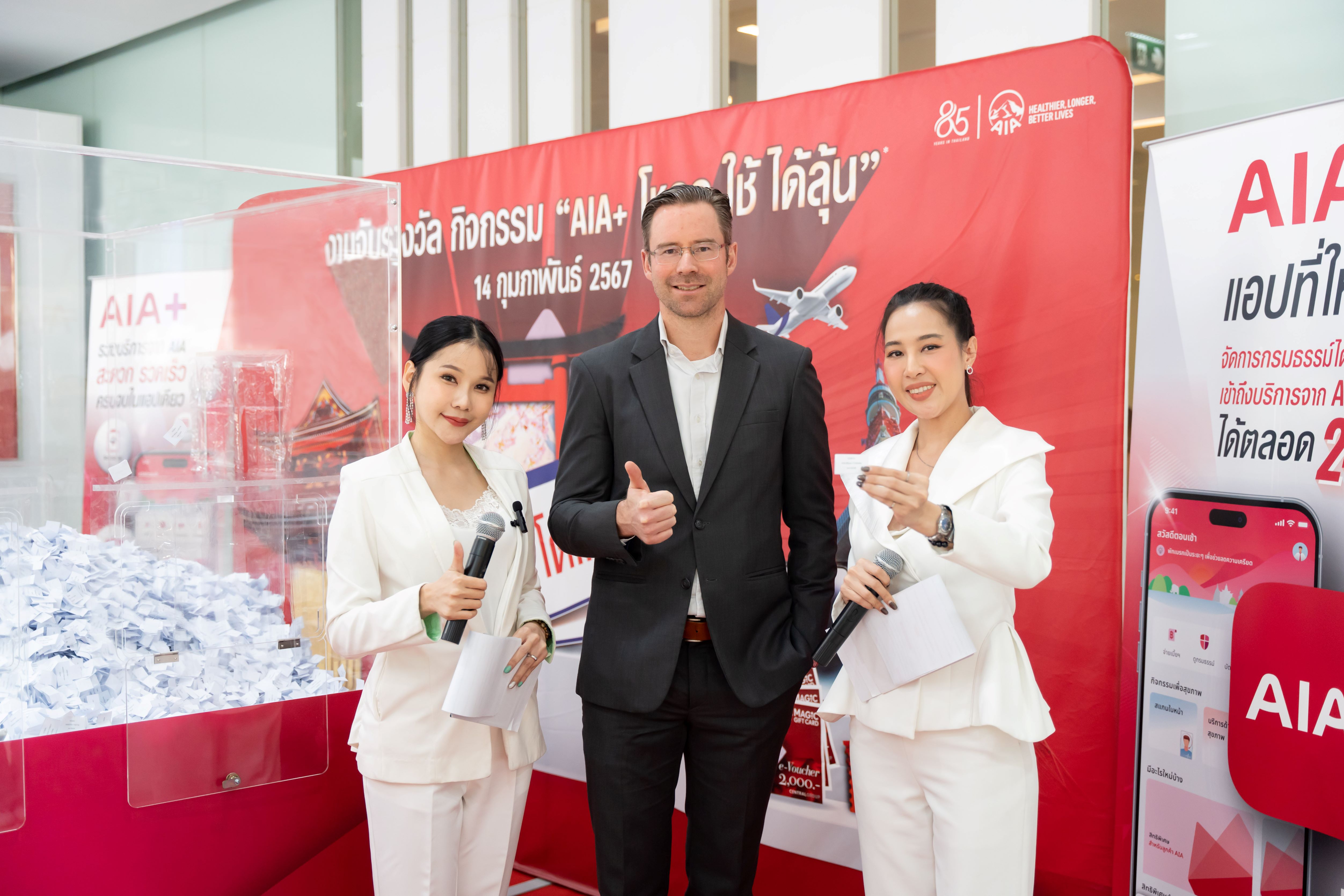 กรุงเทพฯ 14 มีนาคม 2567 : เอไอเอ พลัส (AIA+) จัดหนักจัดเต็ม ส่งความสุขให้ลูกค้าที่ถือกรมธรรม์ของ เอไอเอ ประเทศไทย* ที่ใช้แอปพลิเคชัน AIA+ ให้ได้มีสุขภาพดี พร้อมลุ้นรางวัลใหญ่กับกิจกรรม “เอไอเอ พลัส โหลด-ใช้-ได้ลุ้น” โดยได้ทำการจับรางวัลผู้โชคดี เมื่อวันที่ 14 กุมภาพันธ์ 2567 ที่ผ่านมา นำโดย ดร. คริสเตียน โรแลนด์ ประธานเจ้าหน้าที่ฝ่ายกลยุทธ์และดิจิทัล เอไอเอ ประเทศไทย และ อลิสา สิมะโรจน์ ประธานเจ้าหน้าที่ฝ่ายปฏิบัติการ เอไอเอ ประเทศไทย ซึ่งร่วมเป็นเกียรติในพิธีมอบรางวัลแก่ผู้โชคดีจำนวน 674 ท่านจากกิจกรรมดังกล่าว