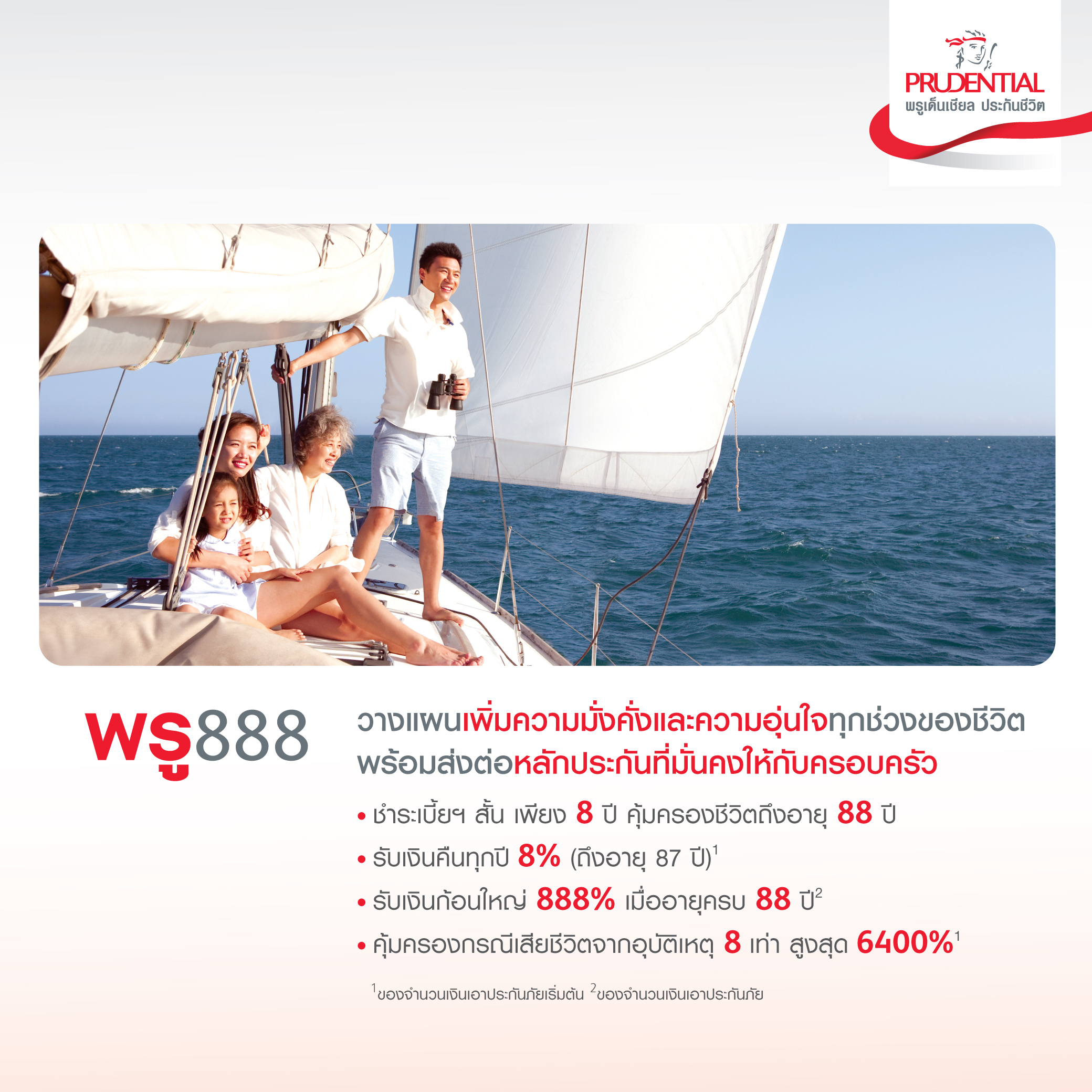 ผลิตภัณฑ์ประกันชีวิต พรู 888 แบบประกันชีวิตที่ขายผ่านทุกช่องทางการขายของพรูเด็นเชียล ประเทศไทย ไม่ว่าจะเป็น ช่องทางตัวแทน รวมถึงช่องทางพันธมิตรต่างๆ (ธนาคารซีไอเอ็มบี ไทย, ธนาคารทหารไทยธนชาต, ธนาคารยูโอบี , AIS Insurance Service และเดอะวัน(The 1)) ที่มีจุดเด่นผลิตภัณฑ์ด้วยการชำระเบี้ยประกันภัยระยะสั้นเพียง 8 ปี และคุ้มครองถึงอายุ 88 ปี พร้อมรับเงินคืนทุกปี ปีละ 8% ของจำนวนเงินเอาประกันภัยเริ่มต้น ยาวจนถึงอายุ 87 ปี และรับเงินก้อนสูงถึง 888% ของจำนวนเงินเอาประกันภัยเริ่มต้น เมื่อครบกำหนดสัญญา