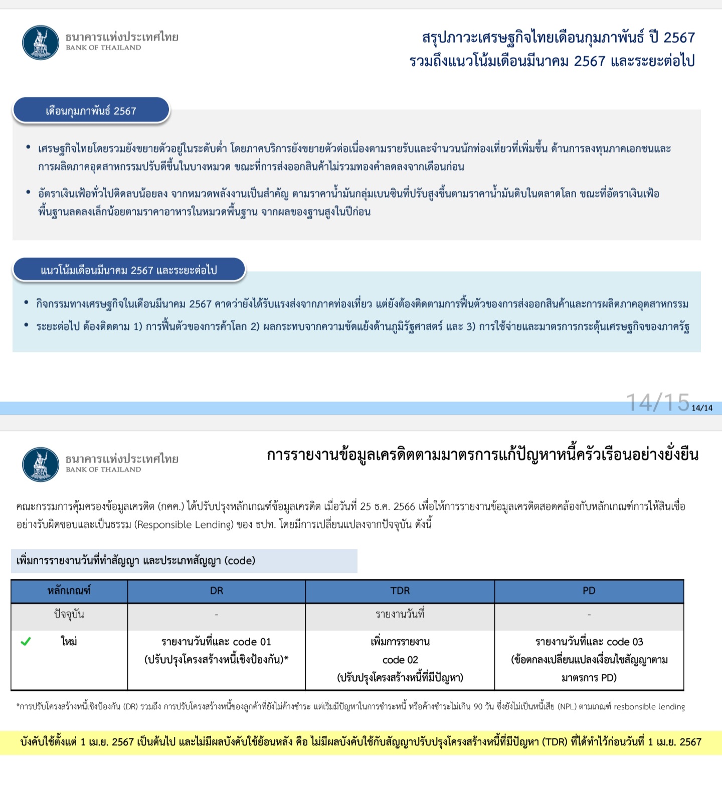 30 มีนาคม 2567 : คุณชญาวดี ชัยอนันต์ ผู้ช่วยผู้ว่าการ สายองค์กรสัมพันธ์ และโฆษก และ คุณอรมนต์ จันทพันธ์ ผู้อำนวยการ ฝ่ายคุ้มครองและตรวจสอบบริการทางการเงิน ธนาคารแห่งประเทศไทย เปิดเผยถึง เศรษฐกิจไทยโดยรวมขยายตัวอยู่ในระดับต่ำ โดยเศรษฐกิจในภาคบริการขยายตัวตามรายรับและจำนวนนักท่องเที่ยวที่เพิ่มขึ้นมาก ด้านการลงทุนภาคเอกชนและการผลิตภาคอุตสาหกรรมปรับดีขึ้น ในบางหมวดขณะที่การบริโภคภาคเอกชนทรงตัว
