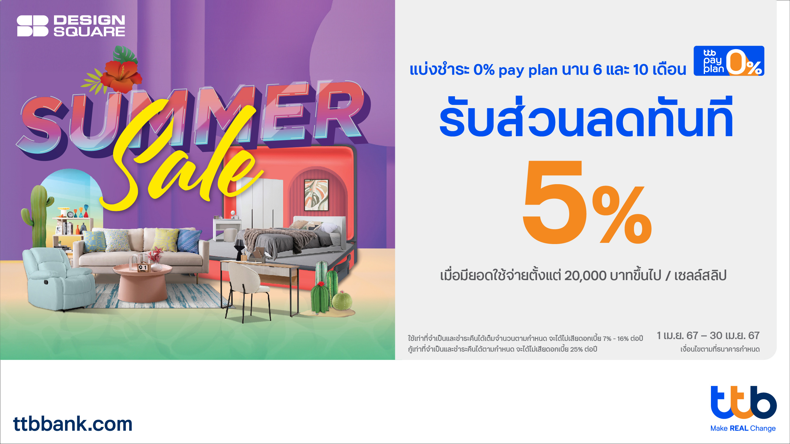 2 เมษายน 2567 : ทีเอ็มบีธนชาต หรือ ทีทีบี ร่วมกับ SB Design Square มอบสิทธิพิเศษแบบ Exclusive สำหรับผู้ถือบัตรเครดิต ttb เมื่อซื้อสินค้าที่ SB Design Square ทุกสาขา ตั้งแต่วันที่ 1 เม.ย. 2567 – 30 เม.ย. 2567 รับส่วนลดทันที 5% เมื่อทำรายการแบ่งชำระ 0% pay plan นาน 6 และ10 เดือน โดยมียอดใช้จ่ายตั้งแต่ 20,000 บาทขึ้นไป / เซลล์สลิป จำกัดการรับส่วนลดสูงสุด 20,000 บาท / บัญชีบัตรหลัก / ตลอดรายการส่งเสริมการขาย เฉพาะสินค้าที่ร่วมรายการ เงื่อนไขตามที่ร้านค้ากำหนด (รายการชำระเต็มจำนวน การชำระผ่านช่องทางออนไลน์ และการชำระผ่านช่องทาง e-wallet ไม่เข้าร่วมรายการ) โดยธนาคารมุ่งช่วยให้ลูกค้าสามารถวางแผนการใช้จ่ายได้ กู้เท่าที่จำเป็นต้องใช้ และผ่อนชำระคืนไหว เพื่อสร้างชีวิตทางการเงินที่ดีขึ้น