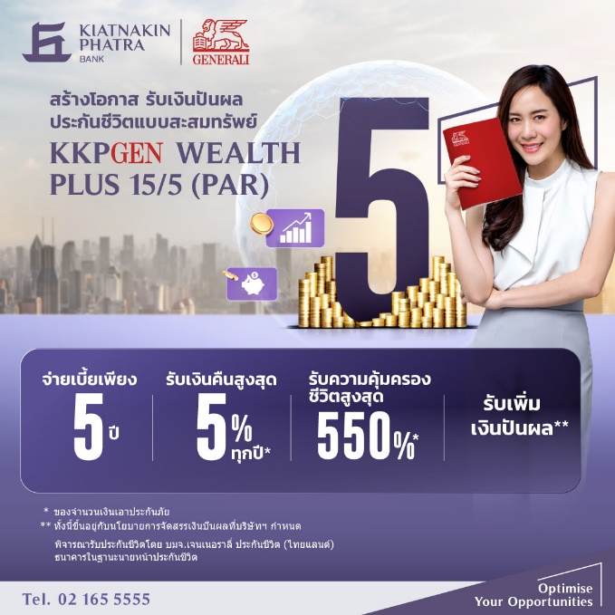 พิเศษ! ซื้อประกัน KKPGEN WEALTH PLUS 15/5 (PAR) ตรงตามเงื่อนไขที่ บมจ. เจนเนอราลี่ ประกันชีวิต (ไทยแลนด์) กำหนด รับสิทธิ์ HONG KONG EXCLUSIVE TRIP สามารถสอบถามรายละเอียดเพิ่มเติมได้ที่ธนาคารเกียรตินาคินทุกสาขา หรือดูรายละเอียดข้อมูลผลิตภัณฑ์ได้ที่ https://link.kkpfg.com/BV5jF หรือ โทร. 0 2 165 5555 พิจารณารับประกันภัย โดย บมจ. เจนเนอราลี่ ประกันชีวิต (ไทยแลนด์) ธนาคารเป็นเพียงนายหน้าประกันชีวิต ทั้งนี้ ผู้ซื้อควรทำความเข้าใจในรายละเอียด ความคุ้มครอง และเงื่อนไขก่อนตัดสินใจทำประกันภัยทุกครั้ง