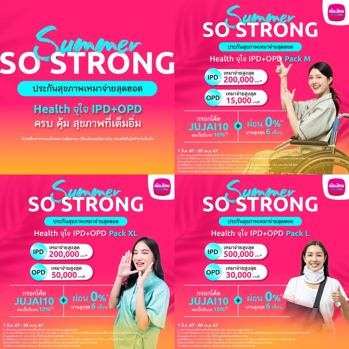 4 เมษายน 2567 : เมืองไทยประกันชีวิต ส่งประกันสุขภาพเหมาจ่ายสุดฮอต “Health จุใจ IPD+OPD” จัดแคมเปญ Summer So Strong ช่วยเพิ่มความอุ่นใจ หายห่วงเรื่องค่ารักษา พร้อมสิทธิพิเศษสุดคุ้มถึง 2 ต่อ เพียงกรอกโค้ด “JUJAI10” และเลือกผ่อนได้ 0% นานสูงสุดถึง 6 เดือน พร้อมรับความสุขและความอุ่นใจได้แล้วตั้งแต่ 1 มีนาคม – 30 เมษายน 2567