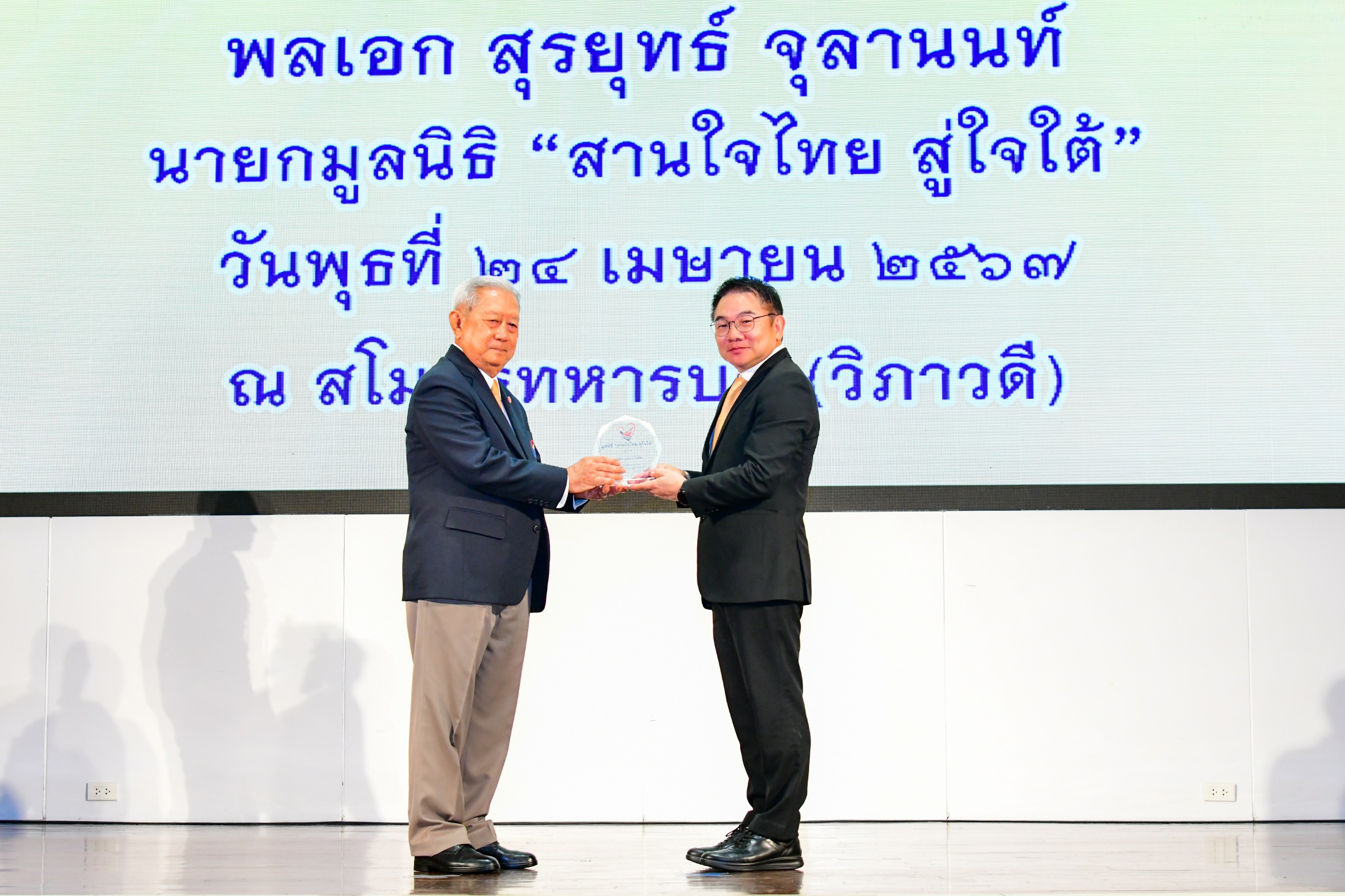 25 เมษายน 2567 : เอไอเอ ประเทศไทย โดย นายสุวิรัช พงศ์เสาวภาคย์ ผู้อำนวยการฝ่ายกิจการภายนอก เป็นตัวแทนรับโล่ประกาศเกียรติคุณจาก พลเอกสุรยุทธ์ จุลานนท์ ประธานองคมนตรี และนายกมูลนิธิ “สานใจไทย สู่ใจใต้” ในโอกาสที่เอไอเอ ประเทศไทย สนับสนุนกรมธรรม์ประกันอุบัติเหตุ จำนวน 320 กรมธรรม์ ให้แก่เยาวชนจาก 5 จังหวัดชายแดนภาคใต้ ได้แก่ จังหวัดยะลา ปัตตานี นราธิวาส สตูล และสงขลา (เฉพาะอำเภอจะนะ เทพา นาทวี และสะบ้าย้อย) ภายใต้โครงการ “สานใจไทย สู่ใจใต้” ต่อเนื่องเป็นปีที่ 2 ซึ่งได้นำเยาวชนรุ่นที่ 42 กว่า 320 คน มาพำนักกับครอบครัวอุปถัมภ์ในกรุงเทพมหานครและจังหวัดใกล้เคียง เพื่อมาเปิดโลกทัศน์ เสริมสร้างประสบการณ์การเรียนรู้ในหลากหลายมิติ ทั้งในเรื่องประวัติศาสตร์ชาติไทย การอนุรักษ์ธรรมชาติและสิ่งแวดล้อม รวมทั้งการอยู่ร่วมกันในสังคมพหุวัฒนธรรม