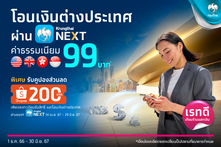 พิเศษ! รับคูปองส่วนลด Shopee มูลค่า 200 บาท เพียงลงทะเบียนรับสิทธิ์ผ่านช่องทาง LINE Krungthai Connext หรือ เมนูโปรโมชันบนแอปพลิเคชัน Krungthai NEXT ภายในวันที่ทำรายการโอนเงินต่างประเทศผ่าน Krungthai ตั้งแต่วันนี้ถึง 29 มิถุนายน 2567