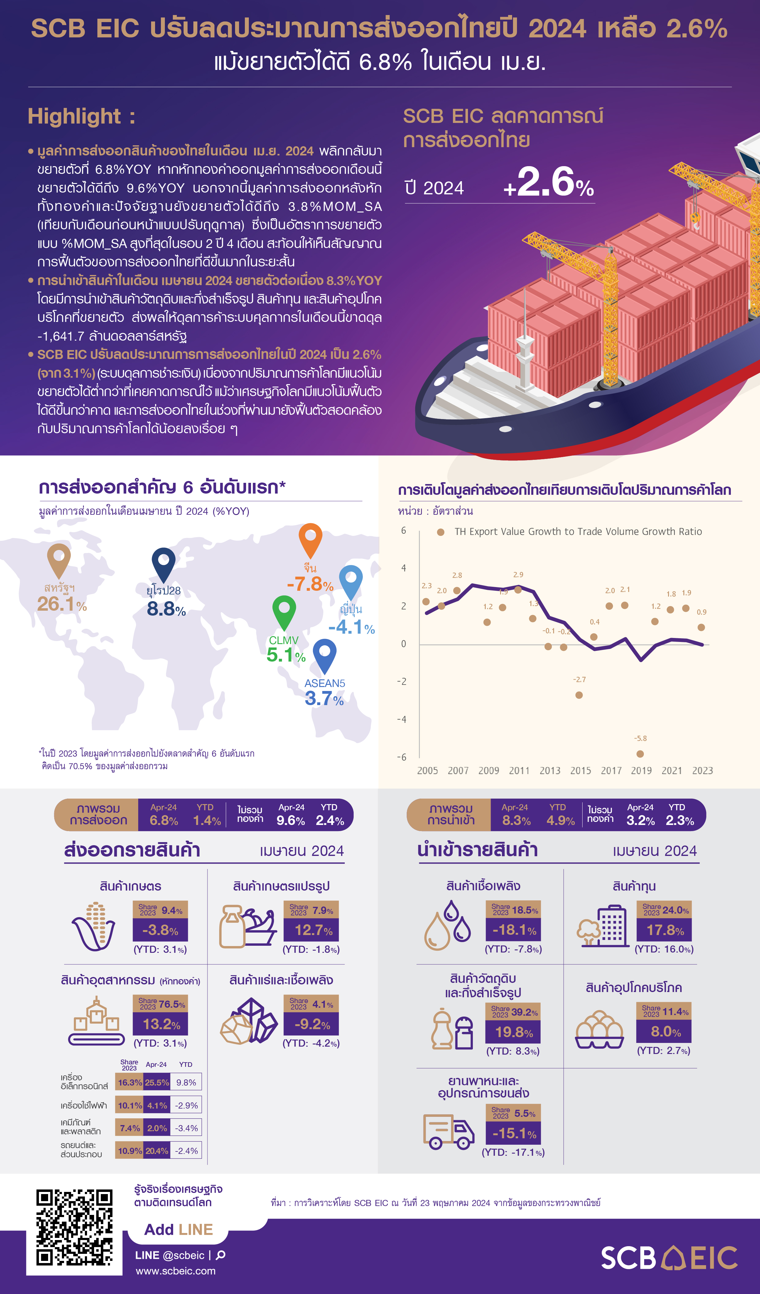 24 พฤษภาคม 2567 : ศูนย์วิจัยเศรษฐกิจและธุรกิจ SCB EIC เปิดเผย บทวิเคราะห์ เรื่อง SCB EIC ปรับลดประมาณการส่งออกไทยปี 2024 เหลือ 2.6% แม้ขยายตัวได้ดี 6.8% ในเดือน เม.ย.