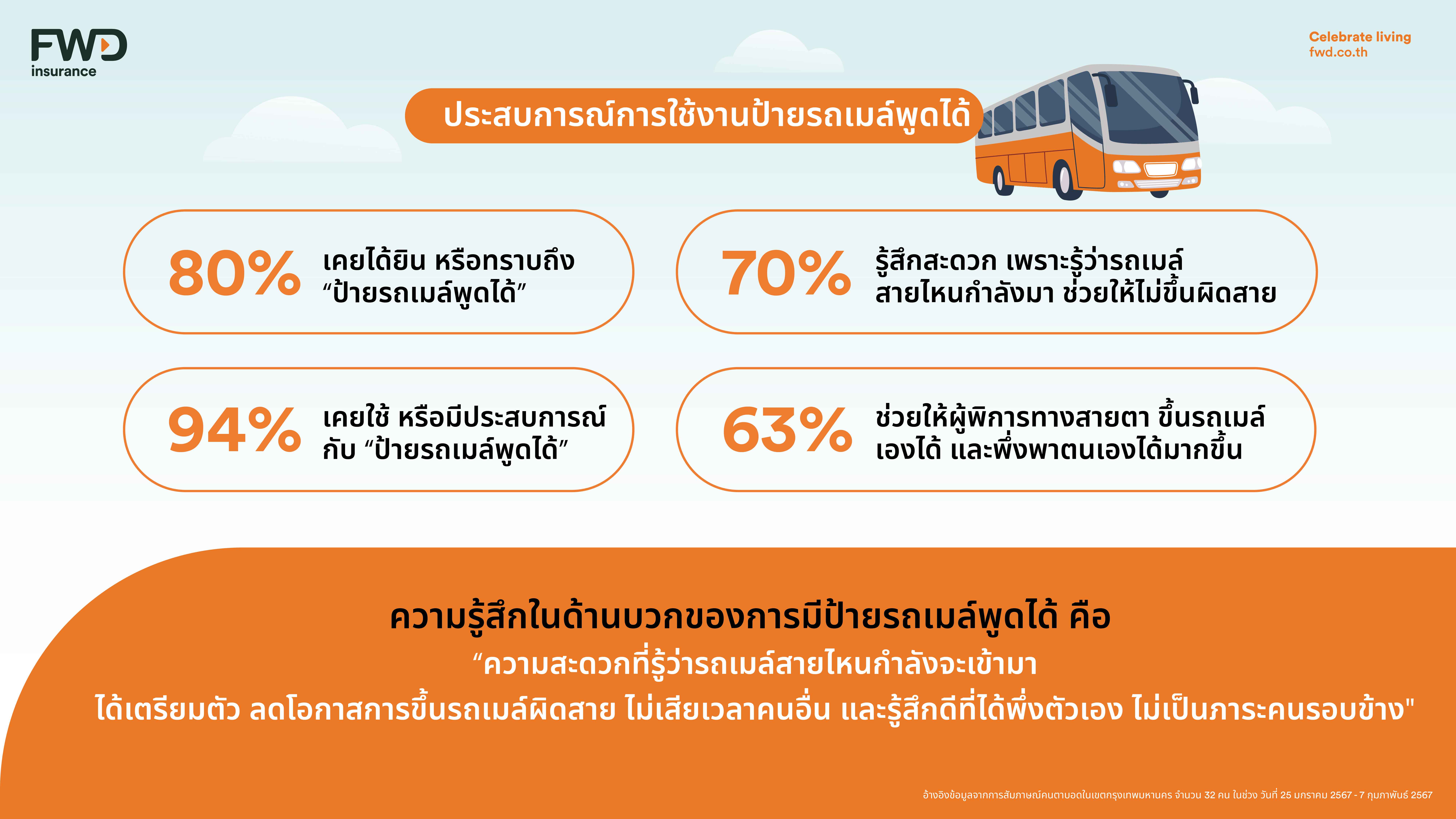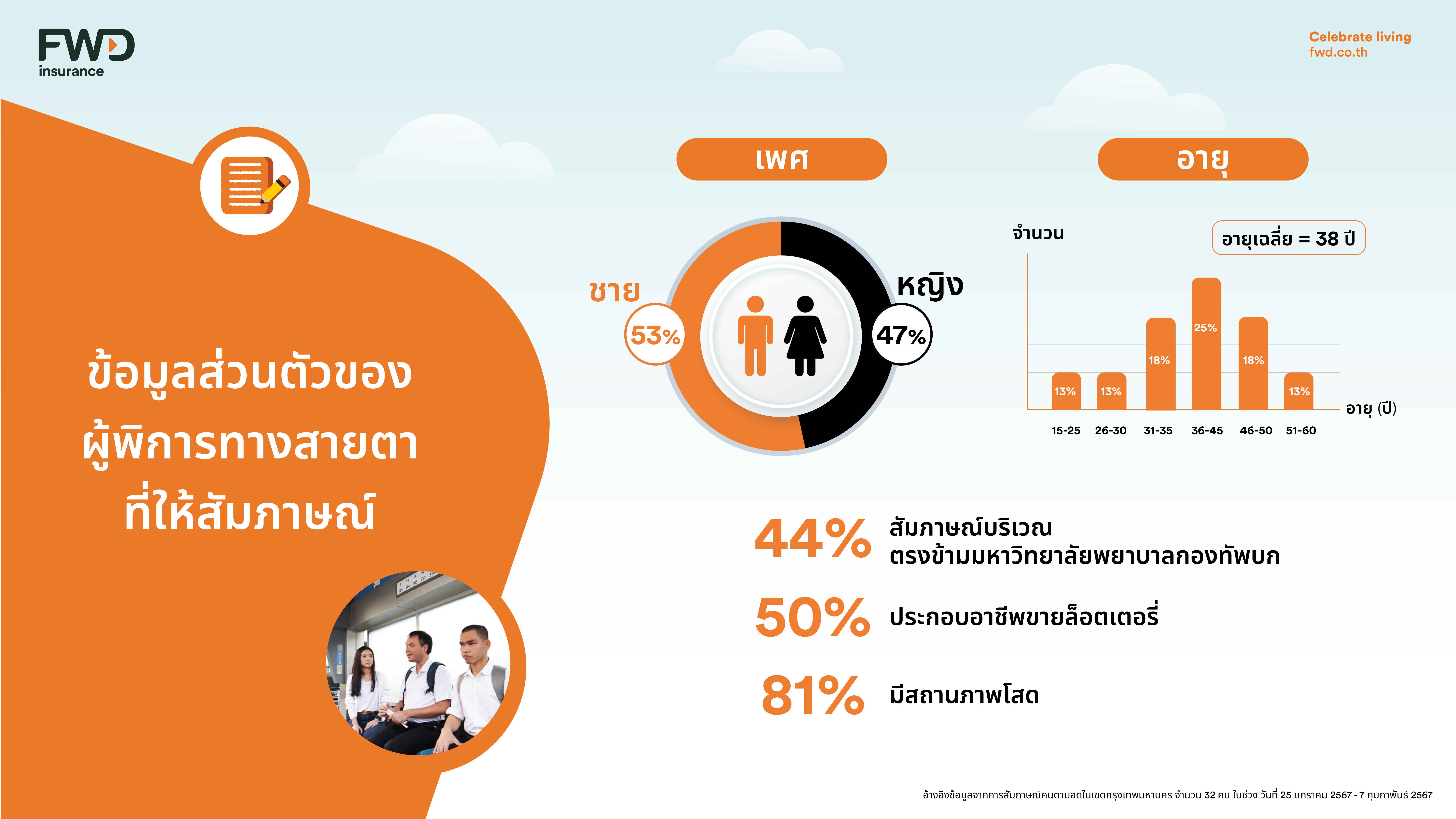 FWD ประกันชีวิต ได้ศึกษาข้อมูลจากรายงานสถานการณ์ด้านคนพิการทางการมองเห็นในประเทศไทย โดยกรมส่งเสริมและพัฒนาคุณภาพชีวิตคนพิการ กระทรวงการพัฒนาสังคมและความมั่นคงของมนุษย์ พบว่า ปัจจุบัน (ข้อมูล ณ วันที่ 31 มีนาคม 2566) ประเทศไทยมีผู้พิการทางสายตา จำนวน 184,622 คน ที่มีการเดินทางเป็นส่วนหนึ่งของชีวิตประจำวัน รวมกับข้อมูลจากการสัมภาษณ์เชิงลึก (in-depth interview) กับผู้พิการทางสายตาภายใต้การดูแลของมูลนิธิช่วยคนตาบอดแห่งประเทศไทย ทำให้เราพบว่า ผู้พิการทางสายตาส่วนใหญ่เลือกใช้การเดินทางประจำวันด้วยรถโดยสารประจำทาง