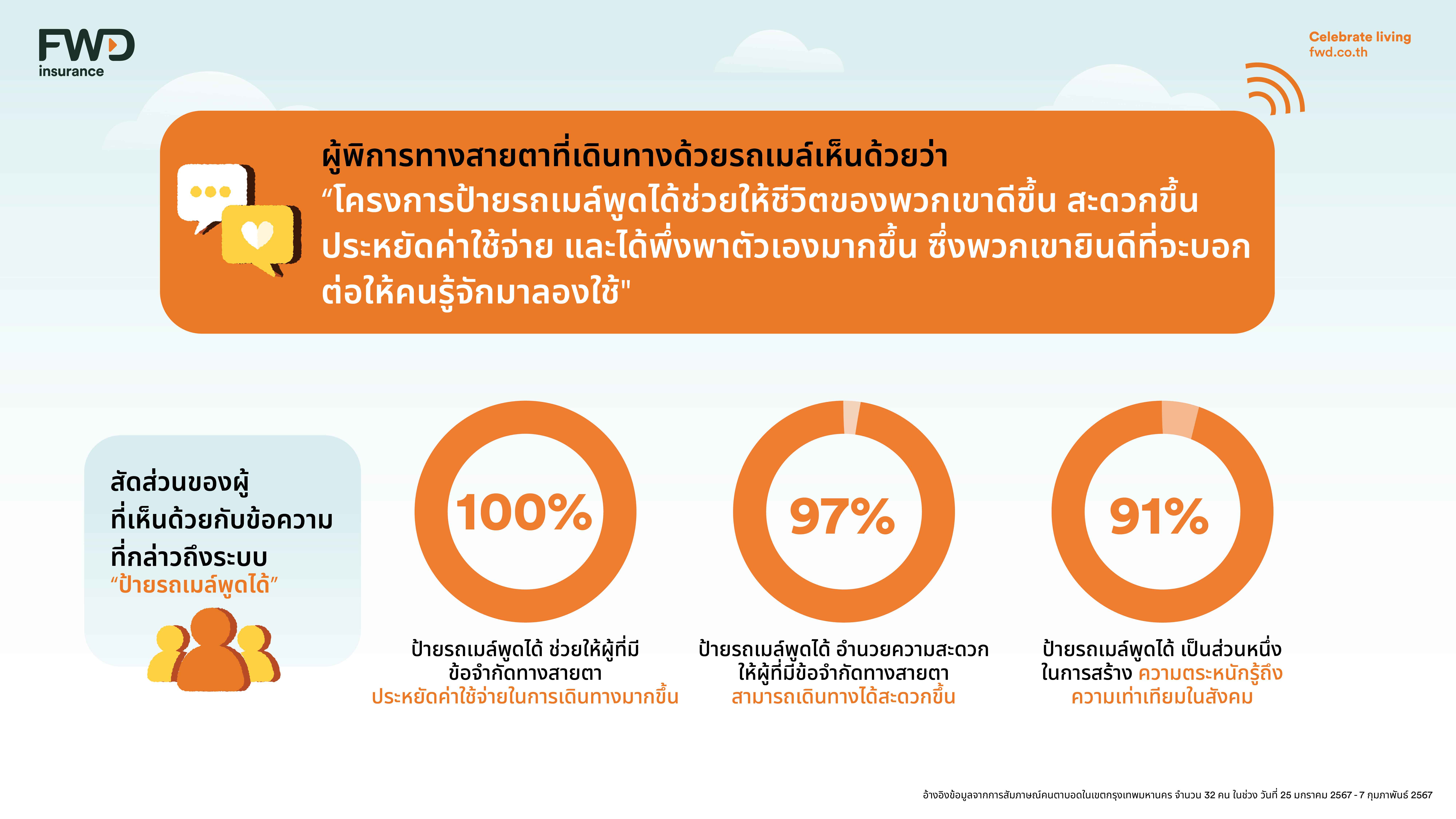 “บทสรุปจากผลวิจัยแคมเปญ “The Talkable Bus Shelter ป้ายรถเมล์พูดได้” คือ การเดินถูกทางในการที่จะช่วยยกระดับความเท่าเทียม นอกเหนือจากการสร้างความตระหนักรู้ เรายังได้ลงมือทำให้เห็นเป็นรูปธรรมอย่างจริงจัง พร้อมทั้งการได้ลงพื้นที่สำรวจ feedback ทำให้ได้ learning เพิ่มเติมเพื่อนำมาพัฒนาต่อได้ FWD ประกันชีวิต ในฐานะองค์กรที่สนับสนุนด้านความหลากหลาย ความเท่าเทียม และเคารพทุกความแตกต่างกันในสังคม รู้สึกภูมิใจที่แคมเปญของเราได้เป็นส่วนหนึ่งของการแก้ปัญหา pain point ในเรื่องการเดินทางโดยรถสาธารณะของกลุ่มผู้พิการทางสายตา