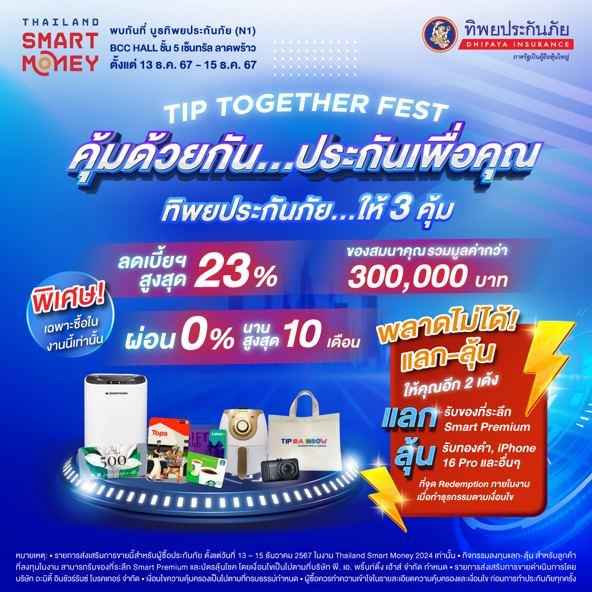 ขอเชิญผู้ที่สนใจ รับข้อเสนอสุดพิเศษได้ที่บูธทิพยประกันภัย (N1) ได้ในงาน Thailand Smart Money 2024 ณ BCC Hall ชั้น 5 เซ็นทรัล ลาดพร้าว ตั้งแต่วันที่ 13 – 15 ธันวาคม 2567