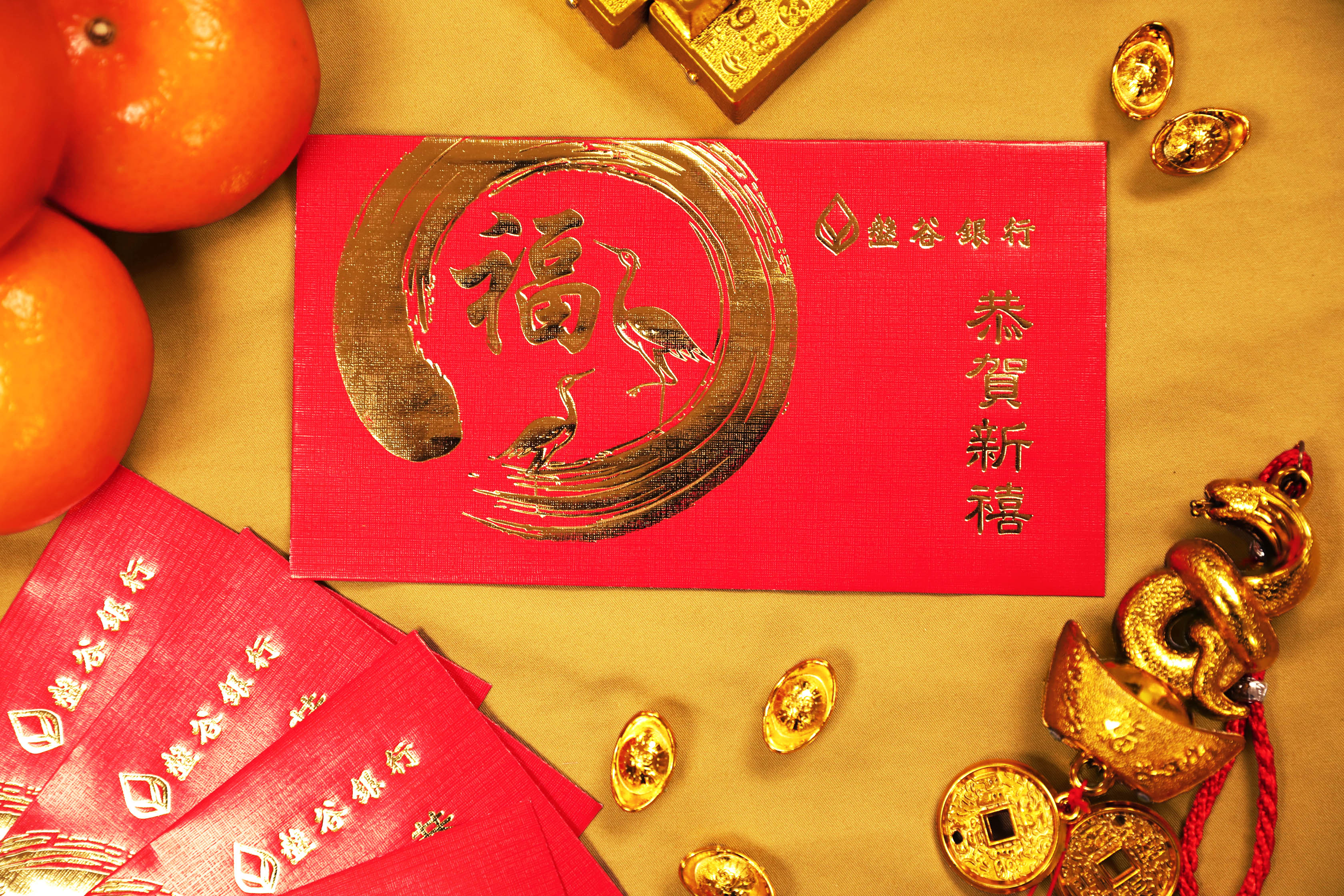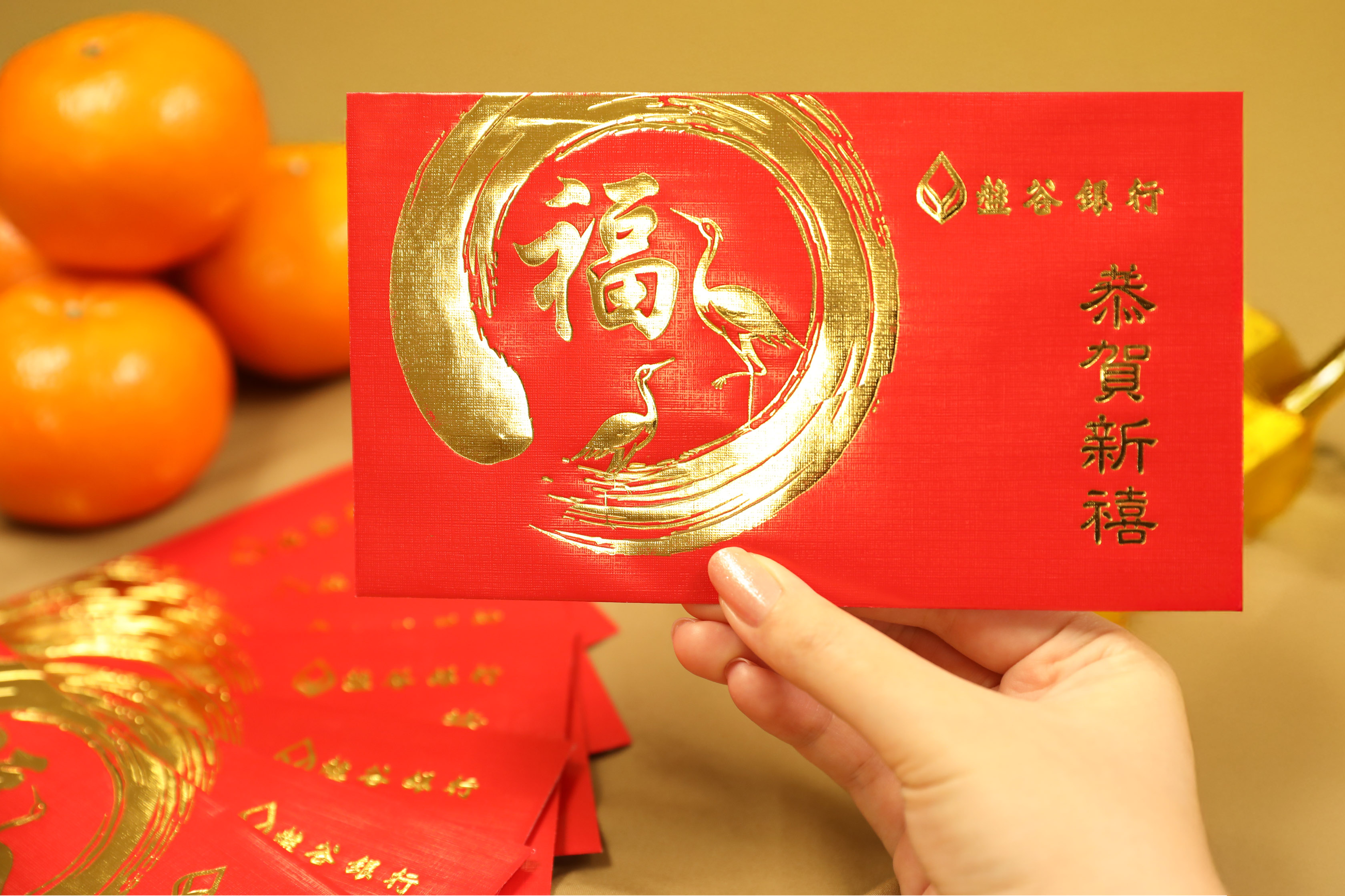สำหรับเทศกาลตรุษจีนปีมะเส็ง 2568 นี้ ธนาคารได้จัดทำซองอั่งเปาสีแดง ด้านหน้าพิมพ์ตัวอักษรมงคลภาษาจีน “福” (ฝู) ซึ่งหมายถึง “ความสุข โชคดี โชคลาภ” และ นกกระเรียนคู่ ซึ่งในวัฒนธรรมจีนเชื่อว่านกกระเรียนเป็นสัตว์มงคลที่เป็นสัญลักษณ์ของ “ความยั่งยืน” เพิ่มความโด่ดเด่นด้วยกรอบรูปวงกลม ลวดลายศิลปะพู่กันจีนที่เป็นเอกลักษณ์ พร้อมด้วยคำอวยพรภาษาจีน “恭贺新禧” (กง เฮ่อ ซิน สี่) ที่มีความหมายว่า “ขอให้ได้รับสิ่งดีๆ ในวันปีใหม่”