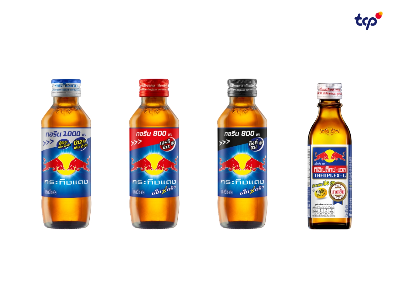 - ทีโอเปล็กซ์ – แอล : เครื่องดื่มให้พลังงานรุ่นแรกของกระทิงแดง มีวิตามินบี 6 สูง มีส่วนช่วยในการสร้างเม็ดเลือดแดงตามปกติ มีทอรีน 850 มก.