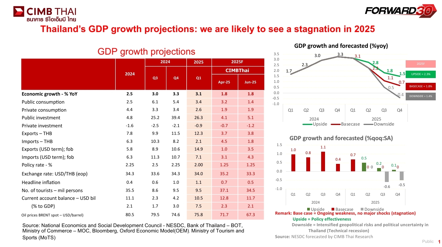 เศรษฐกิจไทยไตรมาสแรกเติบโต 3.1% จากกรณีพิเศษ จึงไม่อยากให้ดีใจมากนัก ทั้งมาจากมาตรการแจกเงินภาครัฐ และการเร่งส่งออกไปสหรัฐก่อนมาตรการภาษี แต่ย่างเข้าไตรมาส 2 เริ่มเห็นความเสี่ยงปะทุเข้ามาจากปัจจัยสงครามการค้า ความขัดแย้งในตะวันออกกลาง และปัญหาเสถียรภาพการเมืองในประเทศ ทั้งนี้ คาดว่า เศรษฐกิจไทยไตรมาสเทียบไตรมาสไม่น่าจะขยายตัวเลย แต่ไตรมาส 2 ปีนี้เทียบปีก่อน น่าจะขยายตัว 2.2% ซึ่งสภาพัฒน์ฯจะรายงานตัวเลขเศรษฐกิจอีกครั้งวันที่ 18 สิงหาคม ซึ่งคาดว่าเศรษฐกิจไทยจะเข้าสู่ภาวะชะงักงันลากยาวตลอดทั้งปี ส่งผลให้เศรษฐกิจไตรมาส 3 และ 4 แบบ YoY จะโตเพียง 1.1% และ 0.7% ตามลำดับ เป็นที่มาของการยืนคาดการณ์เศรษฐกิจไทยปี 2568 ที่ 1.8% เทียบปีก่อนที่ 2.5% แล้วปัจจัยเสี่ยงมาจากไหนบ้าง